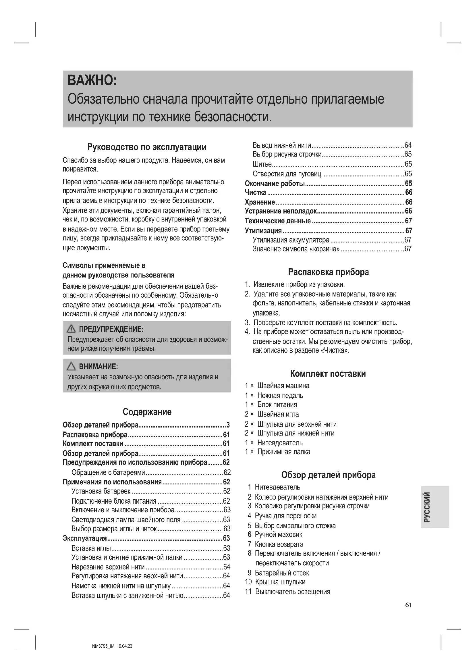 ственные остатки. Мы рекомендуем очистить прибор, как описано в разделе «Чистка». Комплект поставки 1 × Швейная машина 1 × Ножная педаль 1 × Блок питания 2 × Швейная игла 2 × Шпулька для верхней нити 2 × Шпулька для нижней нити 1 × Нитевдеватель 1 × Прижимная лапка Обзор деталей прибора 1 Нитевдеватель 2 Колесо регулировки натяжения верхней нити 3 Колесико регулировки рисунка строчки 4 Ручка для переноски 5 Выбор символьного стежка 6 Ручной маховик 7 Кнопка возврата 8 Переключатель включения / выключения / переключатель скорости 9 Батарейный отсек 10 Крышка шпульки 11 Выключатель освещенияNM3795_IM 19.04.23