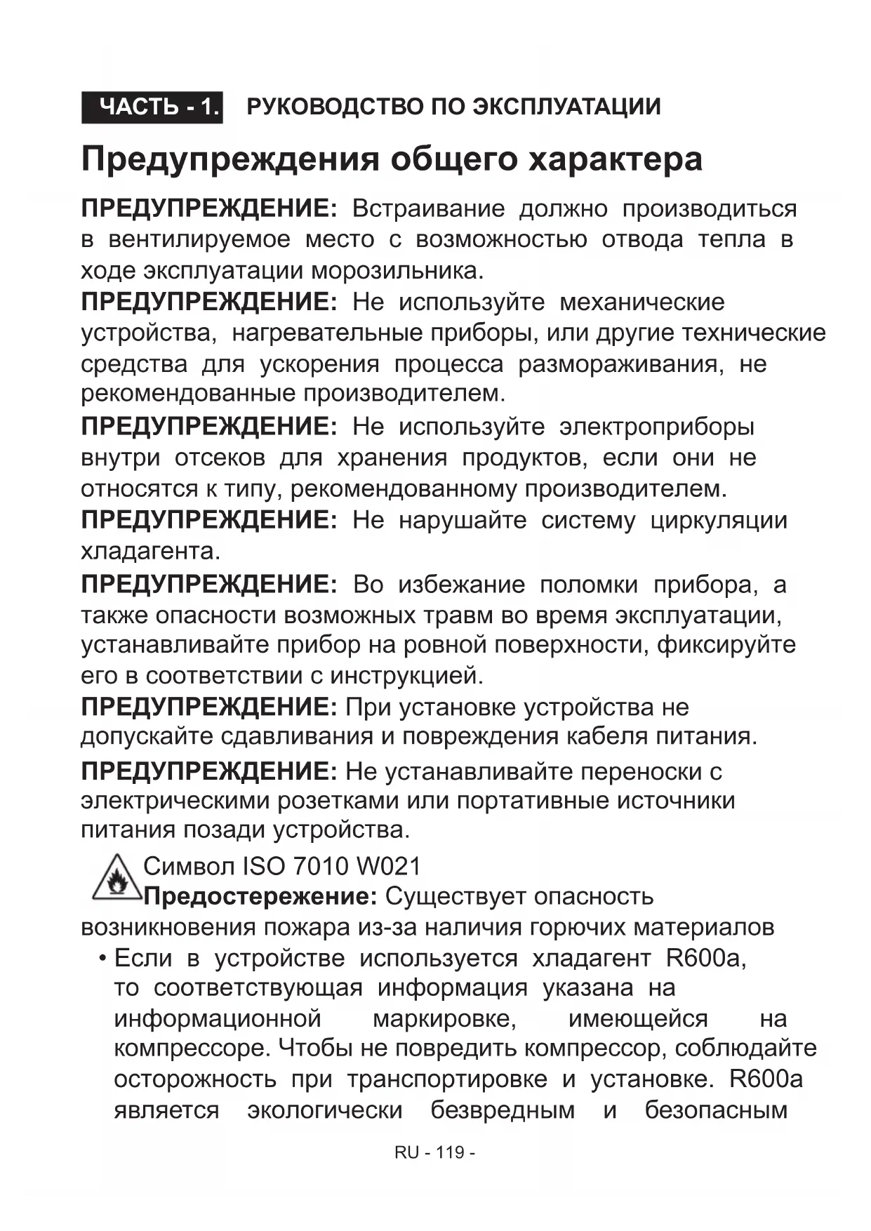 - ДЕТАЛИ И УСТРОЙСТВО ХОЛОДИЛЬНИКА RU - 119 - Предупреждения общего характера ПРЕДУПРЕЖДЕНИЕ: Встраивание должно производиться в вентилируемое место с возможностью отвода тепла в ходе эксплуатации морозильника. ПРЕДУПРЕЖДЕНИЕ: Не используйте механические устройства, нагревательные приборы, или другие технические средства для ускорения процесса размораживания, не рекомендованные производителем. ПРЕДУПРЕЖДЕНИЕ: Не используйте электроприборы внутри отсеков для хранения продуктов, если они не относятся к типу, рекомендованному производителем. ПРЕДУПРЕЖДЕНИЕ: Не нарушайте систему циркуляции хладагента. ПРЕДУПРЕЖДЕНИЕ: Во избежание поломки прибора, а также опасности возможных травм во время эксплуатации, устанавливайте прибор на ровной поверхности, фиксируйте его в соответствии с инструкцией. ПРЕДУПРЕЖДЕНИЕ: При установке устройства не допускайте сдавливания и повреждения кабеля питания. ПРЕДУПРЕЖДЕНИЕ: Не устанавливайте переноски с электрическими розетками или портативные источники питания позади устройства. Символ ISO 7010 W021 Предостережение: Существует опасность возникновения пожара из-за наличия горючих материалов p. 139