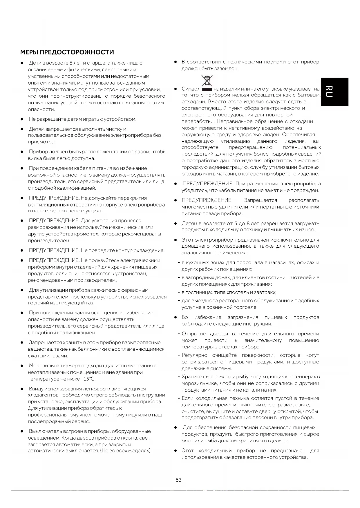 ● Прибор должен быть расположен таким образом, чтобы вилка была легко доступна. ● При повреждении кабеля питания во избежание возможной опасности его замену должен осуществлять производитель, его сервисный представитель или лица с подобной квалификацией. ● ПРЕДУПРЕЖДЕНИЕ. Не допускайте перекрытия вентиляционных отверстий на корпусе электроприбора и на встроенных конструкциях. ● ПРЕДУПРЕЖДЕНИЕ. Для ускорения процесса размораживания не используйте механические или другие устройства кроме тех, которые рекомендованы производителем. ● ПРЕДУПРЕЖДЕНИЕ. Не повредите контур охлаждения. ● ПРЕДУПРЕЖДЕНИЕ. Не пользуйтесь электрическими приборами внутри отделений для хранения пищевых продуктов, если они не относятся к устройствам, рекомендованным производителем. ● Для утилизации прибора свяжитесь с сервисным представителем, поскольку в устройстве использовался горючий изолирующий газ. ● При повреждении лампы освещения во избежание опасности ее замену должен осуществлять производитель, его сервисный представитель или лица с подобной квалификацией. ● Запрещается хранить в этом приборе взрывоопасные вещества, такие как баллончики с воспламеняющимися сжатыми газами. ● Морозильная камера подходит для использования в неотапливаемых помещениях и вне здания при температуре не ниже -15°C. ● Ввиду использования легковоспламеняющихся хладагентов необходимо строго соблюдать инструкции при установке, эксплуатации и обслуживании прибора. Для утилизации прибора обратитесь к профессиональному уполномоченному лицу или в наш послепродажный сервис. ● Выключатель встроен в приборы, оборудованные освещением. Когда дверца прибора открыта, свет загорается автоматически, а при закрытии автоматически выключается. (Не во всех моделях) ● В соответствии с техническими нормами этот прибор должен быть заземлен. ● Символ на изделии или на его упаковке указывает на то, что с прибором нельзя обращаться как с бытовыми отходами. Вместо этого изделие следует сдать в соответствующий пункт сбора электрического и электронного оборудования для повторной переработки. Неправильное обращение с отходами может привести к негативному воздействию на окружающую среду и здоровье людей. Обеспечивая надлежащую утилизацию данного изделия, вы способствуете предотвращению потенциальных последствий. Для получения более подробных сведений о переработке данного изделия обратитесь в местную городскую администрацию, службу утилизации бытовых отходов или в магазин, в котором приобретено изделие. ● ПРЕДУПРЕЖДЕНИЕ. При размещении электроприбора убедитесь, что кабель питания не зажат и не поврежден. ● ПРЕДУПРЕЖДЕНИЕ. Запрещается располагать многоместные удлинители или портативные источники питания позади прибора. ● Детям в возрасте от 3 до 8 лет разрешается загружать продукты в холодильную технику и вынимать их из нее. ● Этот электроприбор предназначен исключительно для домашнего использования, а также для следующего аналогичного применения: - в кухонных зонах для персонала в магазинах, офисах и других рабочих помещениях; - в загородных домах, для клиентов гостиниц, мотелей и в других помещениях для проживания; - в гостиницах типа «постель и завтрак»; - для выездного ресторанного обслуживания и подобных услуг не в розничной торговле. ● Во избежани
