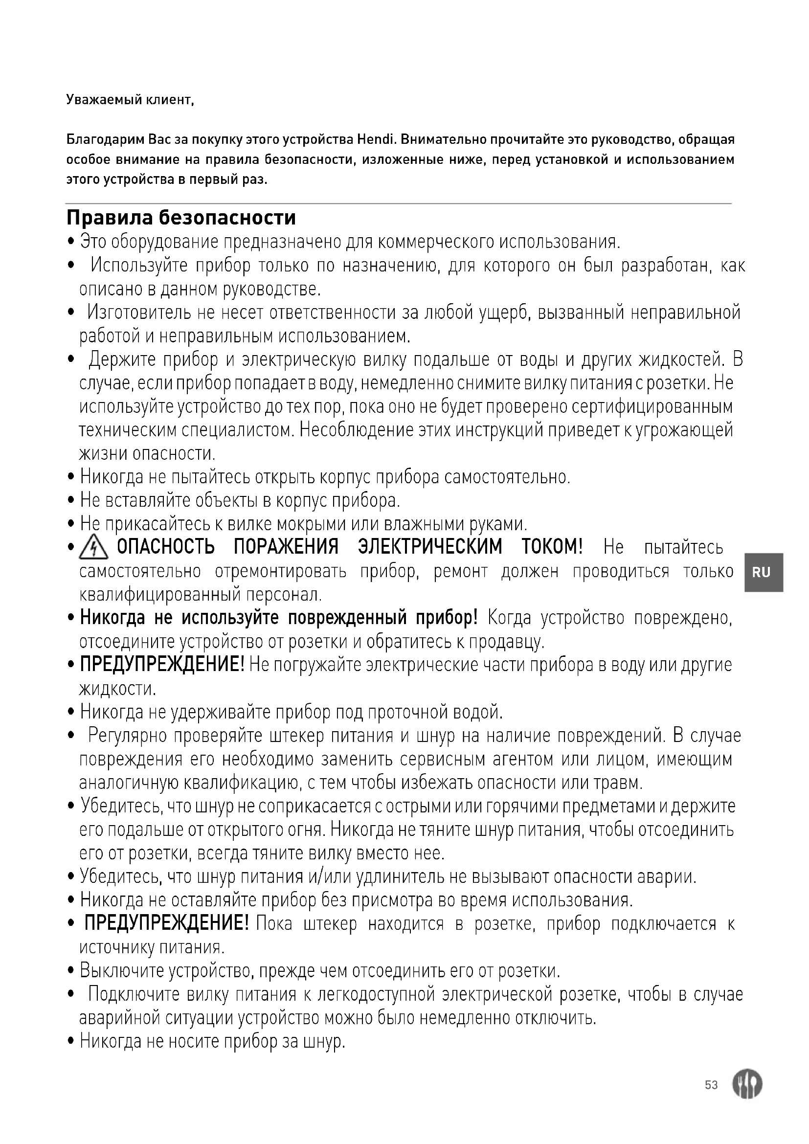 Уважаемый клиент, Благодарим Вас за покупку этого устройства Hendi. Внимательно прочитайте это руководство, обращая особое внимание на правила безопасности, изложенные ниже, перед установкой и использованием этого устройства в первый раз. Правила безопасности