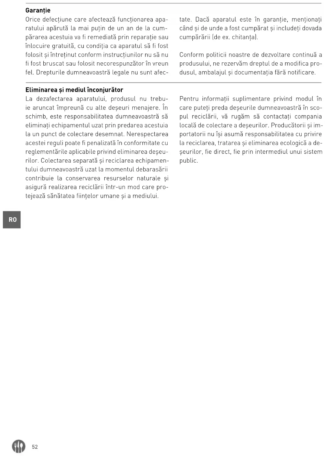 Любая недоделка или поломка, которая влечет за собой неправильную работу устройства, ко- торая будет выявлена в течение первого года от даты покупки, будет устранена бесплатно, или же все устройство будет заменено новым, если оно эксплуатировалось и обслуживалось согласно инструкции по обслуживанию и не использова- лось неправильно, или в разрез с назначением. Данное положение ни коей мере не нарушает иных прав потребителя, изложенных в законо- дательстве. В случае заявления устройства в ре- монт или на замену в рамках гарантии, следует указать место и дату покупки устройства и прило- жить счет, или чековую квитанцию. Согласно нашей политике совершенствования наших продуктов оставляем за собой право на ввод изменений в конструкцию, упаковку и в тех- нические параметры, указываемые в техниче- ской документации без предупреждения. Утилизация и защита окружающей среды В случае вывода оборудования из эксплуатации, продукт нельзя утилизировать вместе с другими бытовыми отходами. Пользователь несет ответ- ственность за передачу оборудования в соот- ветствующий пункт приёма техники бывшей в употреблении. Несоблюдение вышеуказанного положения может привести к наложению штра- фов в соответствии с действующими правилами в отношении утилизации отходов. Селективный сбор и утилизация использованного оборудо- вания способствуют сохранению природных ресурсов и обеспечивают рециркуляцию таким образом, который не вреден для здоровья и окружающей среды. Для получения дополнительной информации о том, где можно отдать использованное обору- дование для утилизации, обратитесь в местную компанию по сбору отходов. Производитель и импортер не несут ответственности за рецирку- ляцию и переработку отходов экологически без- опасным способом, как непосредственно, так и в рамках государственной системы.60