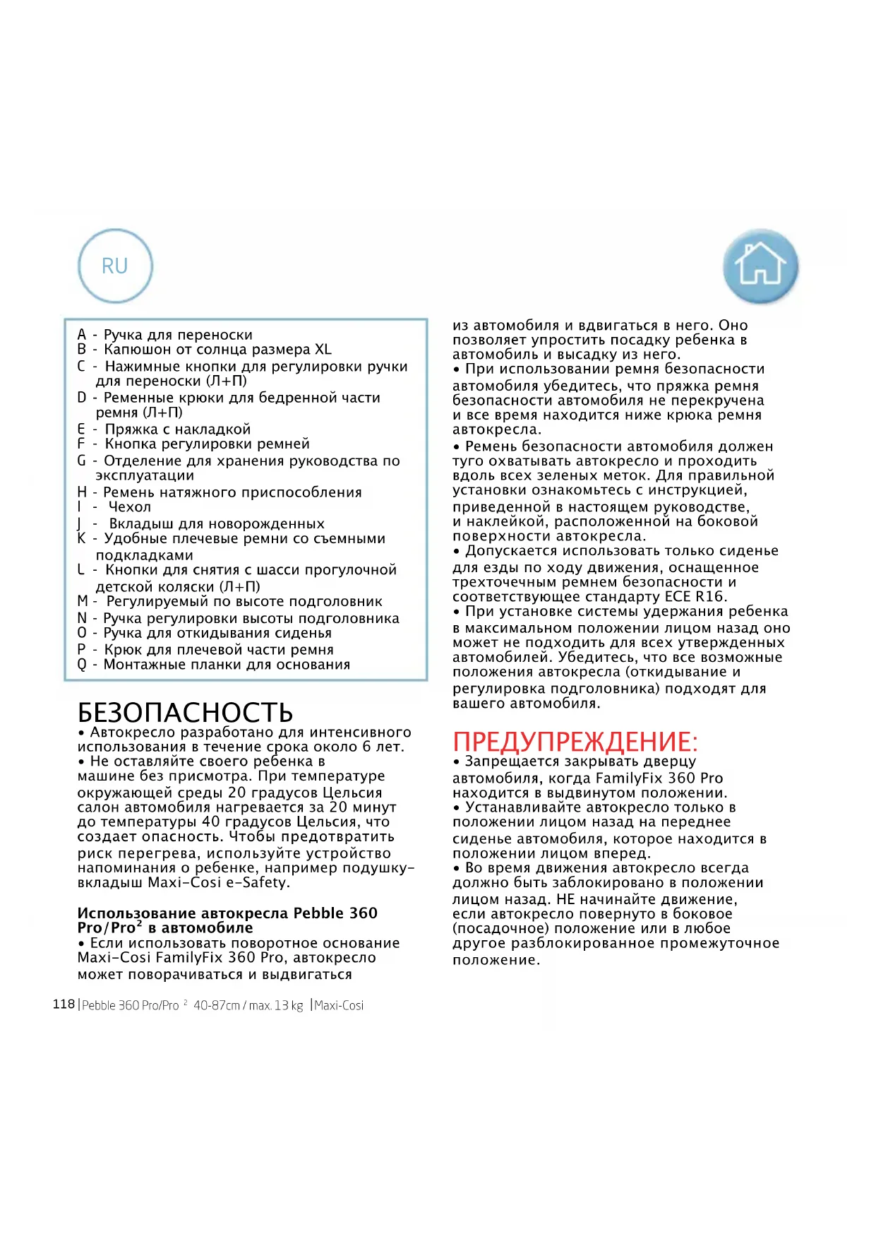 Pebble 360 Pro/Pro² – это универсальная улучшенная система удержания ребенка с ремнями безопасности. Эта система отвечает требованиям Регламента ООН № 129 (нормам стандарта безопасности i-Size) для использования преимущественно в «универсальных положениях для сидения», как указано производителями транспортных средств в руководствах по эксплуатации транспортных средств. В случае возникновения сомнений проконсультируйтесь с производителем улучшенной детской удерживающей системы или продавцом. Это детское автокресло является частью семейства кресел 360 Pro Family и обеспечивает полную подвижность детей от самого их рождения до достижения возраста приблизительно 4 лет. Чтобы узнать больше о нормах стандарта безопасности i-Size, посетите веб-сайт www.maxi-cosi.com. Категория вашего автокресла: i-Size (40-87 см – возраст примерно до 18 месяцев) Положение автокресла: лицом назад