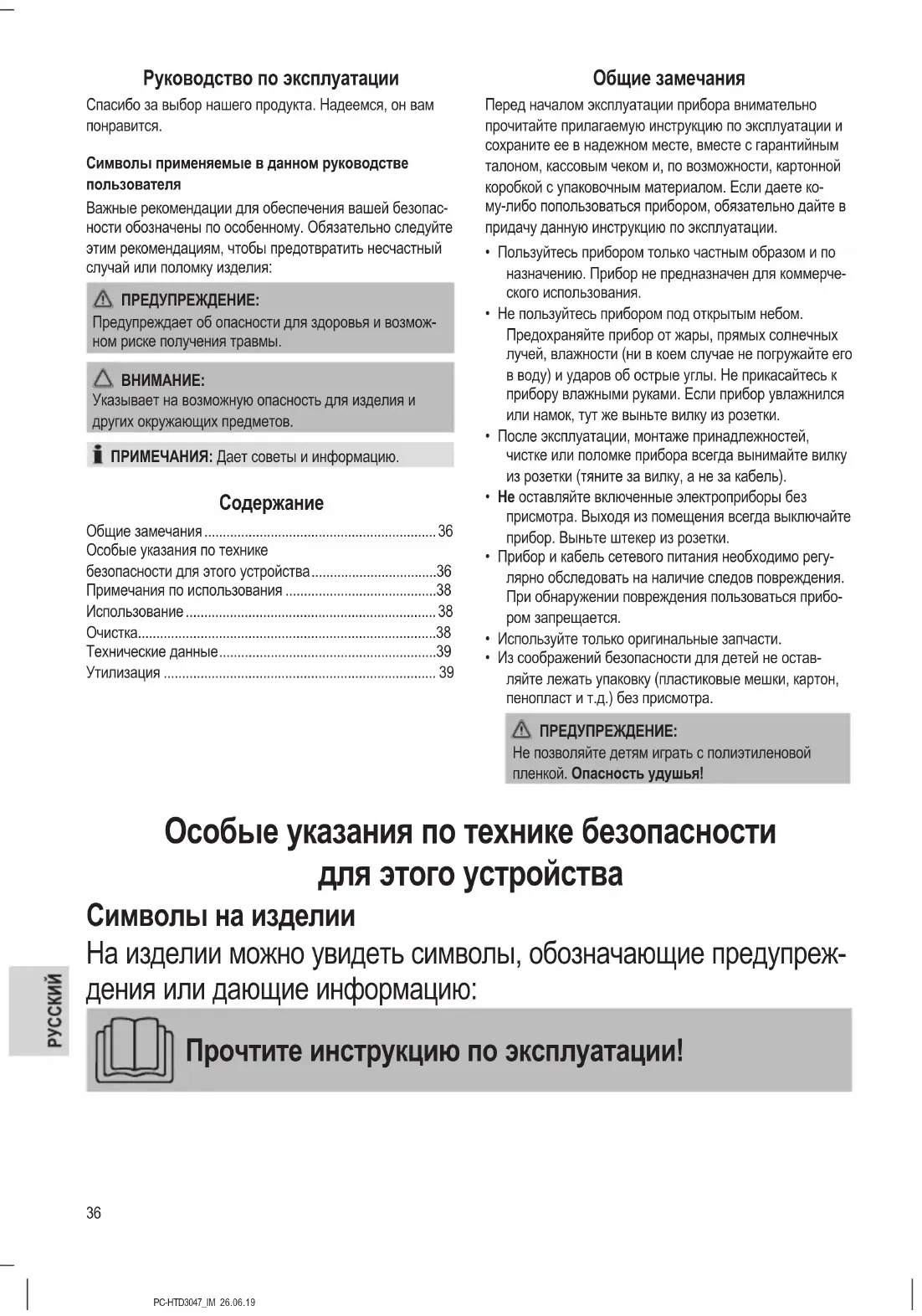 - Из соображений безопасности для детей не остав- ляйте лежать упаковку (пластиковые мешки, картон, пенопласт и т.д.) без присмотра. ПРЕДУПРЕЖДЕНИЕ: Не позволяйте детям играть с полиэтиленовой пленкой. Опасность удушья! Особые указания по технике безопасности для этого устройства Символы на изделии На изделии можно увидеть символы, обозначающие предупреж- дения или дающие информацию: Прочтите инструкцию по эксплуатации!37 PC-HTD3047_IM 26.06.19 ОПАСНОСТЬ УДАРА ЭЛЕКТРОТОКОМ! Не используйте это устройство возле ванны, раковин или других емкостей с водой. ПРЕДУПРЕЖДЕНИЕ: