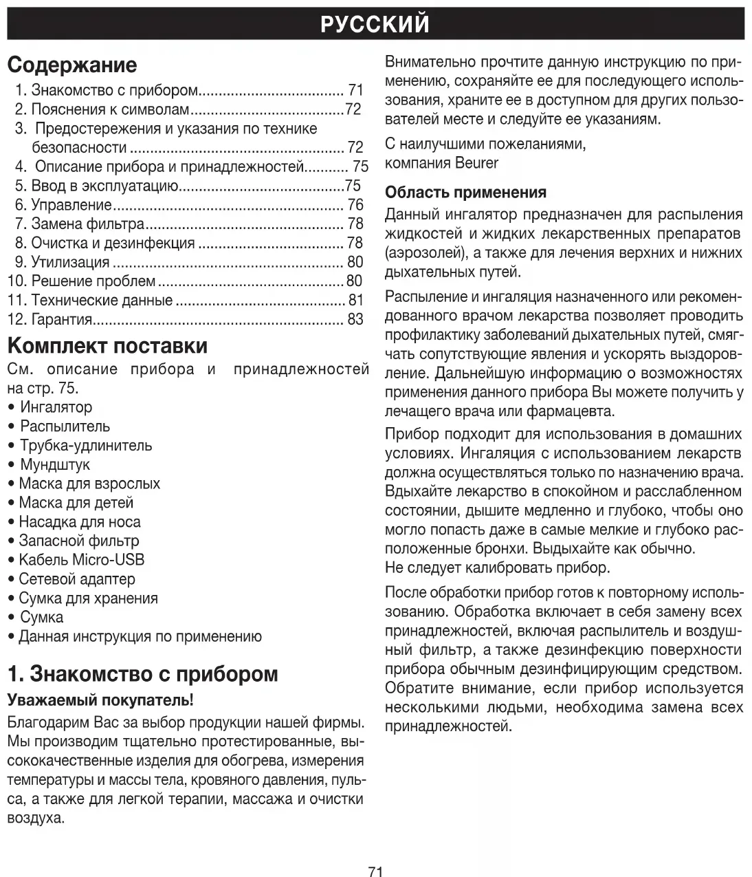 Внимательно прочтите данную инструкцию попри- менению, сохраняйте еедля последующего исполь- зования, храните еевдоступном для других пользо- вателей месте иследуйте ееуказаниям. Снаилучшими пожеланиями, компания Beurer Область применения Данный ингалятор предназначен для распыления жидкостей ижидких лекарственных препаратов (аэрозолей), атакже для лечения верхних инижних дыхательных путей. Распыление и ингаляция назначенного или рекомен- дованного врачом лекарства позволяет проводить профилактику заболеваний дыхательных путей, смяг- чать сопутствующие явления и ускорять выздоров- ление. Дальнейшую информацию о возможностях применения данного прибора Вы можете получить у лечащего врача или фармацевта. Прибор подходит для использования вдомашних условиях. Ингаляция сиспользованием лекарств должна осуществляться только поназначению врача. Вдыхайте лекарство вспокойном ирасслабленном состоянии, дышите медленно иглубоко, чтобы оно могло попасть даже всамые мелкие иглубоко рас- положенные бронхи. Выдыхайте как обычно. Неследует калибровать прибор. После обработки прибор готов кповторному исполь- зованию. Обработка включает всебя замену всех принадлежностей, включая распылитель ивоздуш- ный фильтр, атакже дезинфекцию поверхности прибора обычным дезинфицирующим средством. Обратите внимание, если прибор используется несколькими людьми, необходима замена всех принадлежностей.