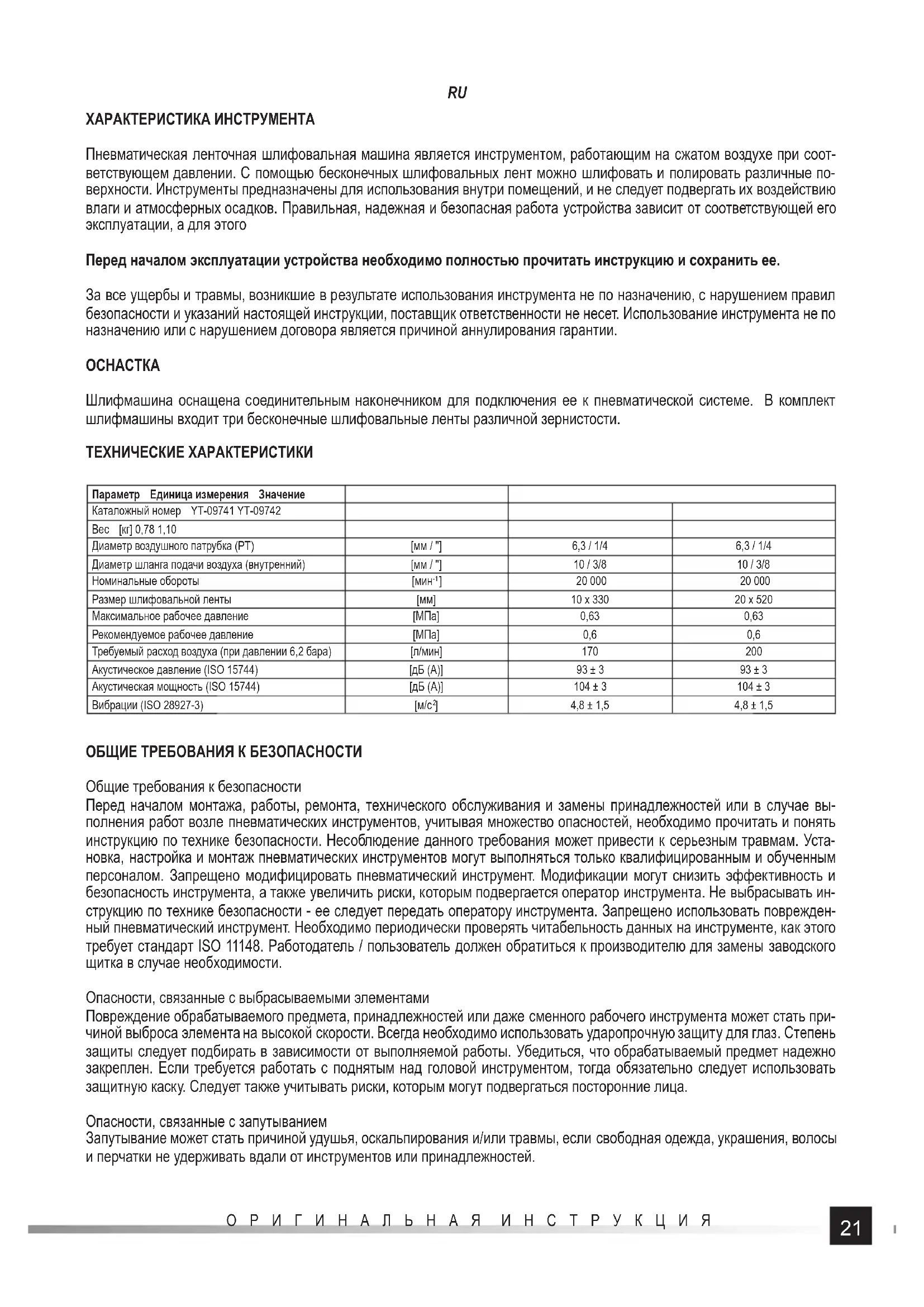 ] 4,8 ± 1,5 4,8 ± 1,5 ОБЩИЕ ТРЕБОВАНИЯ К БЕЗОПАСНОСТИ Общие требования к безопасности Перед началом монтажа, работы, ремонта, технического обслуживания и замены принадлежностей или в случае вы- полнения работ возле пневматических инструментов, учитывая множество опасностей, необходимо прочитать и понять инструкцию по технике безопасности. Несоблюдение данного требования может привести к серьезным травмам. Уста- новка, настройка и монтаж пневматических инструментов могут выполняться только квалифицированным и обученным персоналом. Запрещено модифицировать пневматический инструмент. Модификации могут снизить эффективность и безопасность инструмента, а также увеличить риски, которым подвергается оператор инструмента. Не выбрасывать ин- струкцию по технике безопасности - ее следует передать оператору инструмента. Запрещено использовать поврежден- ный пневматический инструмент. Необходимо периодически проверять читабельность данных на инструменте, как этого требует стандарт ISO 11148. Работодатель / пользователь должен обратиться к производителю для замены заводского щитка в случае необходимости. Опасности, связанные с выбрасываемыми элементами Повреждение обрабатываемого предмета, принадлежностей или даже сменного рабочего инструмента может стать при- чиной выброса элемента на высокой скорости. Всегда необходимо использовать ударопрочную защиту для глаз. Степень защиты следует подбирать в зависимости от выполняемой работы. Убедиться, что обрабатываемый предмет надежно закреплен. Если требуется работать с поднятым над головой инструментом, тогда обязательно следует использовать защитную каску. Следует также учитывать риски, которым могут подвергаться посторонние лица. Опасности, связанные с запутыванием Запутывание может стать причиной удушья, оскальпирования и/или травмы, если свободная одежда, украшения, волосы и перчатки не удерживать вдали от инструментов или принадлежностей.22 ОРИГИНАЛЬНАЯ ИНСТРУКЦИЯ