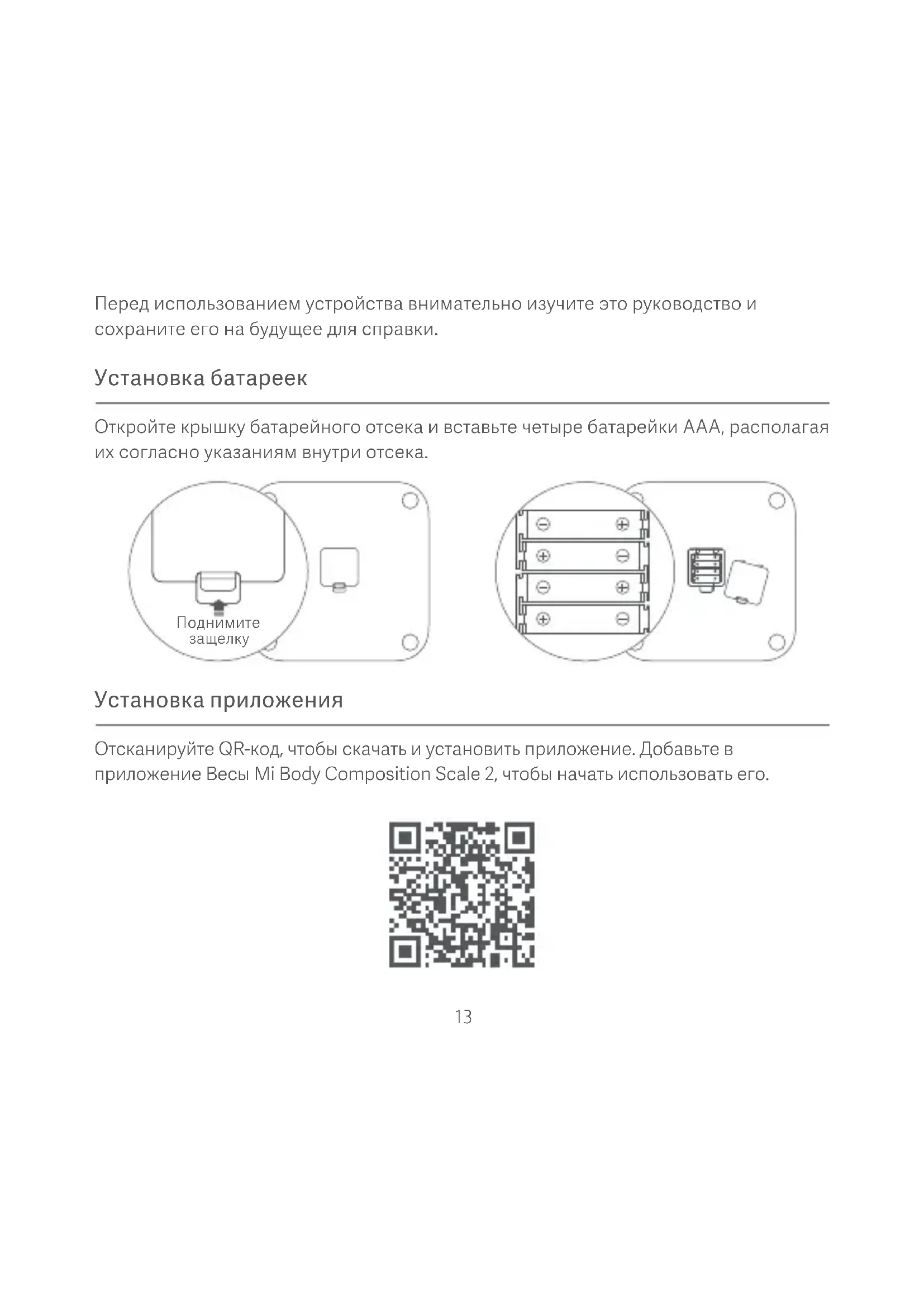 Откройте крышку батарейного отсека и вставьте четыре батарейки AAA, располагая их согласно указаниям внутри отсека. Установка батареек Отсканируйте QR-код, чтобы скачать и установить приложение. Добавьте в приложение Весы Mi Body Composition Scale 2, чтобы начать использовать его. Установка приложения14 Откройте приложение и войдите с помощью своей учетной записи Mi, а затем выполните сопряжение весов с учетной записью и введите свои личные данные согласно инструкциям на экране. После сопряжения весов вы можете просматривать результаты взвешиваний и данные о составе тела в приложении. Личные данные используются для анализа композиционного состава тела. Чтобы обеспечить точность результатов, введите их правильно. Сопряжение с весами Разместите весы на твердом, плоском полу. Станьте босиком на весы, как показано на рисунке. Убедитесь, что кожа стоп хорошо соприкасается с четырьмя металлическими электродами на весах. Определив ваш вес, устройство начнет анализировать состав тела. Как только этот процесс завершится, строка состояния под указанным весом начнет мигать. После этого вы сможете просмотреть результаты анализа на своем мобильном телефоне. Взвешивание и измерение количества жира в организме15 Данные о композиционном составе тела, полученные с помощью этих весов, носят справочный характер и не являются медицинскими рекомендациями. Разместите весы на твердой, плоской поверхности. Нажмите на весы, чтобы включить их. Дождитесь появления надписи "0.00" и поместите на весы предмет, который требуется взвесить. Движения и толчки могут повлиять на точность весов. В этом случае повторите взвешивание, чтобы убедиться в точности измерений. Взвешивание предметов Мигающая буква L при взвешивании обозначает низкий уровень заряда. Следует заменить батарейки как можно