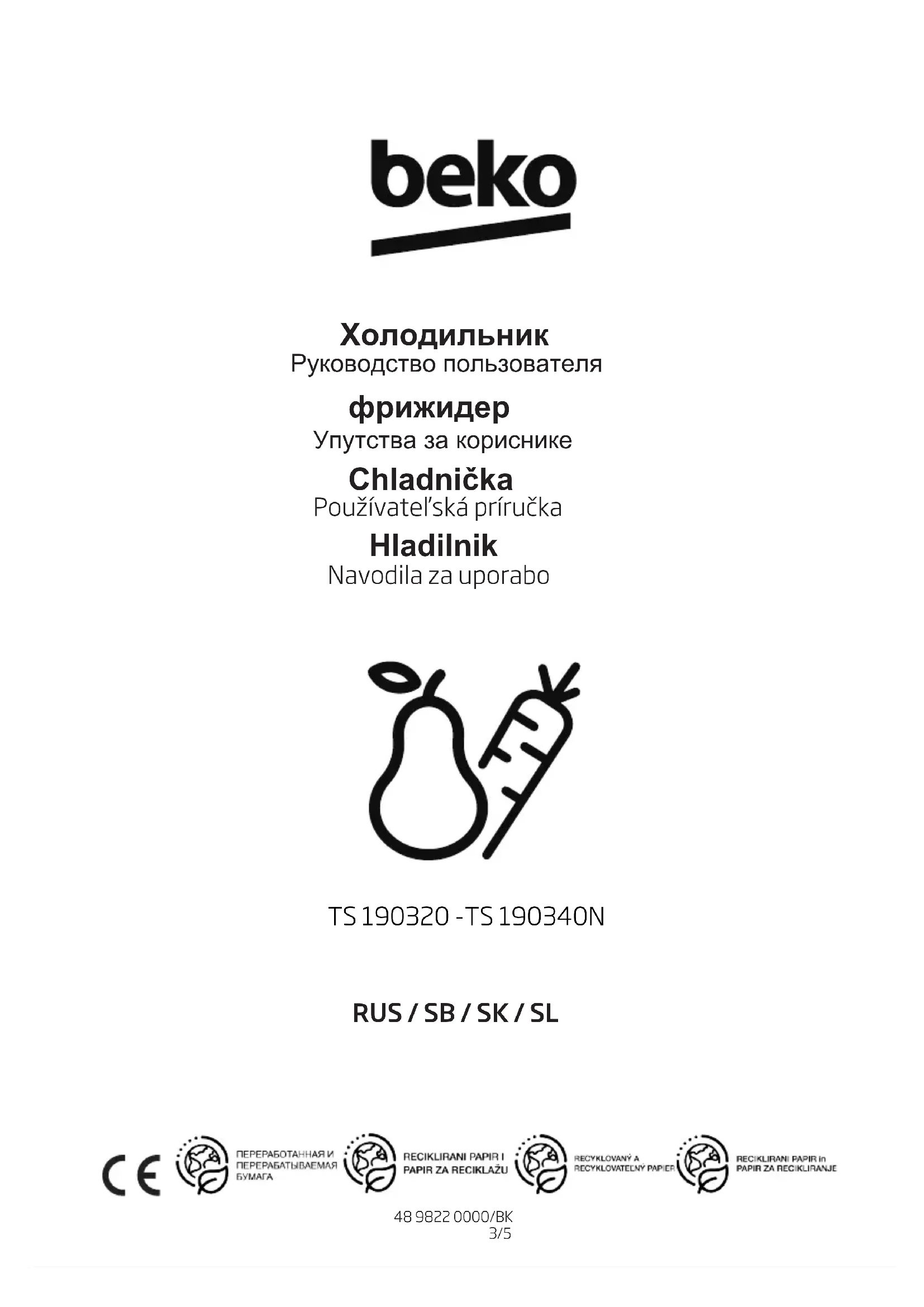Упутства за кориснике Chladnička Používateľská príručka Hladilnik Navodila za uporabo 48 9822 0000/BK 3/5 TS 190320 -TS 190340N RUS / SB / SK / SLОбязателно прочтите данное руководство! Уважаемй покупател! Надеемся, что наше изделие, изготовленное на современном оборудовании и прошедшее тщателнй контрол качества, будет надежно служит вам. Потому, прежде чем ползоватся прибором, рекомендуем внимателно изучит данное руководство и всегда держат его под рукой в качестве справочника. Данное руководство
