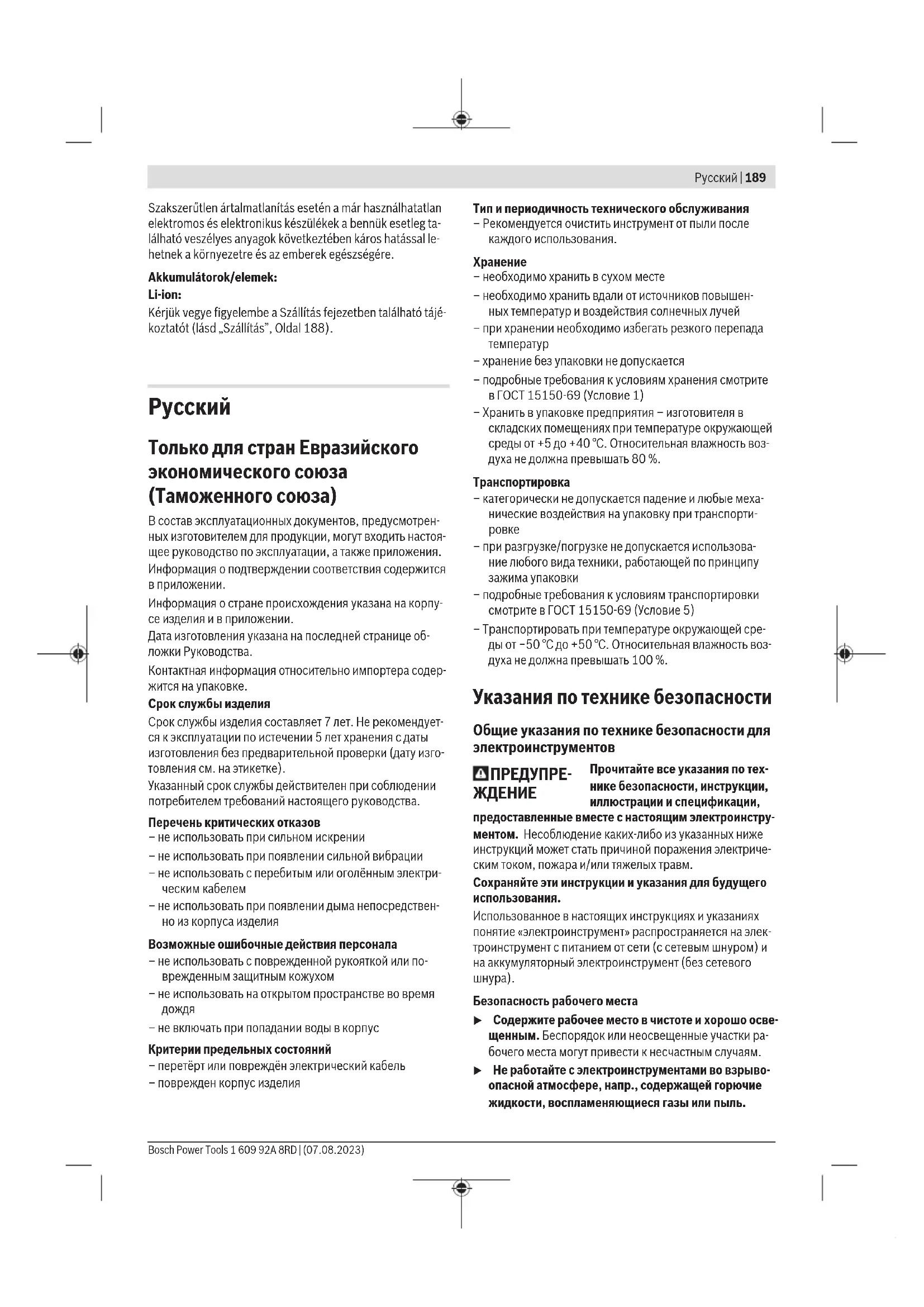 Осуществляйте шабрение на высокой частоте колебаний. На мягкой поверхности (напр., на древесине) работайте с минимально возможным углом и малым усилием прижа- тия. В противном случая шпатель может врезаться в об- рабатываемую поверхность. Термическая защита от перегрузки При использовании электроинструмента по назначению его перегрузка не возможна. Чрезмерная нагрузка или несоблюдение допустимого диапазона температур для аккумулятора приводит к снижению частоты вращения или отключению электроинструмента. Если снизилась ча- стота вращения, то полное число оборотов элек- троинструмент наберет только после того, как температу- ра аккумулятора достигнет допустимого диапазона или снова уменьшится нагрузка. При автоматическом отклю- чении выключите электроинструмент, дайте аккумуля- торной батарее остыть и затем опять включите элек- троинструмент. Техобслуживание и сервис Техобслуживание и очистка u До начала работ по техобслуживанию, смене инструмента и т.д., а также при транспортировке и хранении извлекайте аккумулятор из элек- троинструмента. При непреднамеренном включении возникает опасность травмирования. u Для обеспечения качественной и безопасной рабо- ты содержите электроинструмент и вентиляцион- ные прорези в чистоте. Регулярно очищайте абразивные сменные инструменты с помощью проволочной щетки. Реализацию продукции разрешается производить в мага- зинах, отделах (секциях), павильонах и киосках, обеспе- чивающих сохранность продукции, исключающих попа- дание на неё атмосферных осадков и воздействие источ- ников повышенных температур (резкого перепада темпе- ратур), в том числе солнечных лучей. Продавец (изготовитель) обязан предоставить покупате- лю необходимую и достоверную информацию о продук- ции, обеспечивающую возможность её правильного вы- бора. Информация о продукции в обязательном порядке должна содержать сведения, перечень которых установ- лен законодательством Российской Федерации. Если приобретаемая потребителем продукция была в употреблении или в ней устранялся недостаток (недостат- ки), потребителю должна быть предоставлена информа- ция об этом. Bosch Power Tools 1 609 92A 8RD | (07.08.2023)202 | Русский В процессе реализации продукции должны выполняться следующие требования безопасности: – Продавец обязан довести до сведения покупателя фирменное наименование своей организации, место её нахождения (адрес) и режим её работы; – Образцы продукции в торговых помещениях должны обеспечивать возможность ознакомления покупателя с надписями на изделиях и исключать любые самосто- ятельные действия покупателей с изделиями, приво- дящие к запуску изделий, кроме визуального осмотра; – Продавец обязан довести до сведения покупателя ин- формацию о подтверждении соответствия этих изде- лий установленным требованиям, о наличии сертифи- катов или деклараций о соответствии; – Запрещается реализация продукции при отсутствии (утрате) её идентификационных признаков, с истёк- шим сроком годности, следами порчи и без инструк- ции (руководства) по эксплуатации, обязательного сертификата соответствия либо знака соответствия. Сервис и консультирование по вопросам