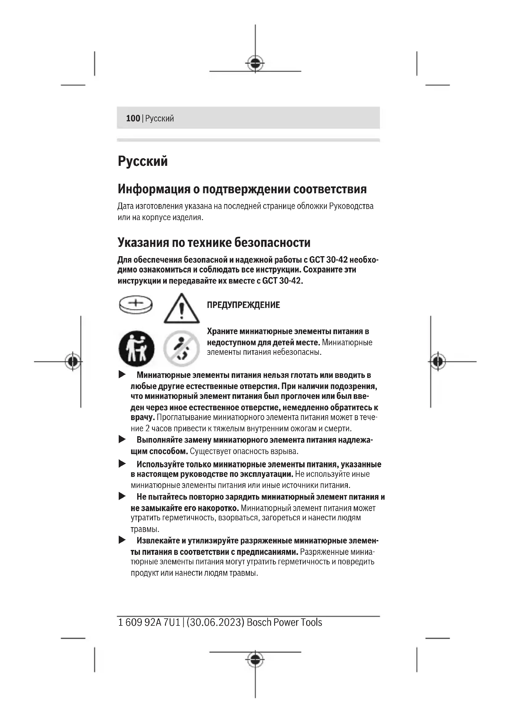 Информация о подтверждении соответствия Дата изготовления указана на последней странице обложки Руководства или на корпусе изделия. Указания по технике безопасности Для обеспечения безопасной и надежной работы с GCT 30-42 необхо- димо ознакомиться и соблюдать все инструкции. Сохраните эти инструкции и передавайте их вместе с GCT 30-42. ПРЕДУПРЕЖДЕНИЕ Храните миниатюрные элементы питания в недоступном для детей месте. Миниатюрные элементы питания небезопасны. u Миниатюрные элементы питания нельзя глотать или вводить в любые другие естественные отверстия. При наличии подозрения, что миниатюрный элемент питания был проглочен или был вве- ден через иное естественное отверстие, немедленно обратитесь к врачу. Проглатывание миниатюрного элемента питания может в тече- ние 2часов привести к тяжелым внутренним ожогам и смерти. u Выполняйте замену миниатюрного элемента питания надлежа- щим способом. Существует опасность взрыва. u Используйте только миниатюрные элементы питания, указанные в настоящем руководстве по эксплуатации. Не используйте иные миниатюрные элементы питания или иные источники питания. u Не пытайтесь повторно зарядить миниатюрный элемент питания и не замыкайте его накоротко. Миниатюрный элемент питания может утратить герметичность, взорваться, загореться и нанести людям