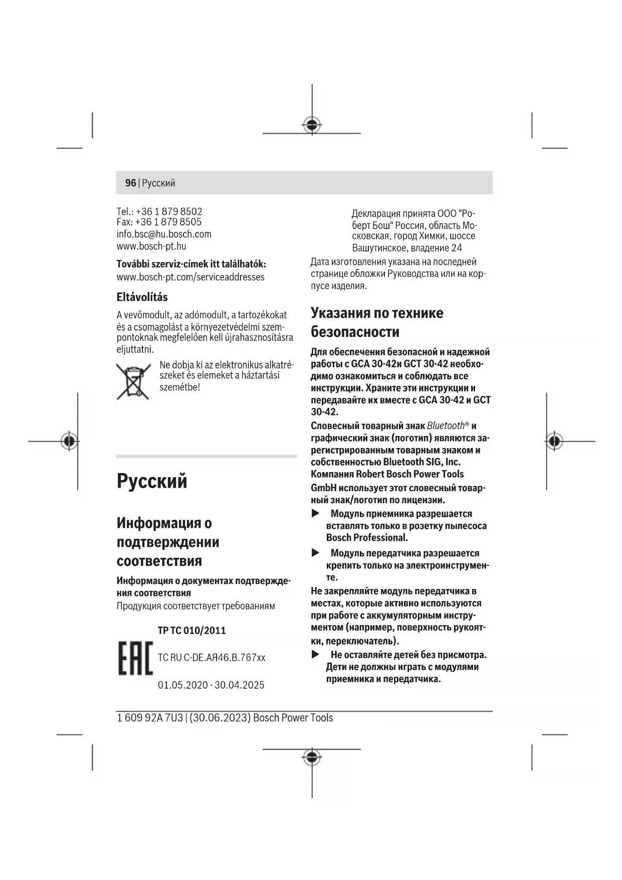Информация о подтверждении соответствия Информация о документах подтвержде-ния соответствияПродукция соответствует требованиямTP TC 010/2011ТС RU С-DE.АЯ46.В.767xx01.05.2020 - 30.04.2025Декларация принята ООО "Ро-берт Бош" Россия, область Мо-сковская, город Химки, шоссеВашутинское, владение 24Дата изготовления указана на последнейстранице обложки Руководства или на кор-пусе изделия. Указания по технике безопасности Для обеспечения безопасной и надежнойработы с GCA30-42и GCT 30-42 необхо-димо ознакомиться и соблюдать всеинструкции. Храните эти инструкции ипередавайте их вместе с GCA30-42 и GCT30-42.Словесный товарный знак Bluetooth® играфический знак (логотип) являются за-регистрированным товарным знаком исобственностью Bluetooth SIG, Inc.Компания Robert Bosch Power ToolsGmbH использует этот словесный товар-ный знак/логотип по лицензии. u Модуль приемника разрешается вставлять только в розетку пылесосаBosch Professional. u Модуль передатчика разрешается крепить только на электроинструмен- Не закрепляйте модуль передатчика вместах, которые активно используютсяпри работе с аккумуляторным инстру-ментом (например,поверхность рукоят-ки, переключатель). u Не оставляйте детей без присмотра. Дети не должны играть с модулямиприемника и передатчика. 1 609 92A 7U3 | (30.06.2023) Bosch Power ToolsРусский | 97 ПРЕДУПРЕЖДЕНИЕ Храните миниатюр- ные элементы пита- ния в недоступном для детей месте. Ми- ниатюрные элементы питания небезопас-