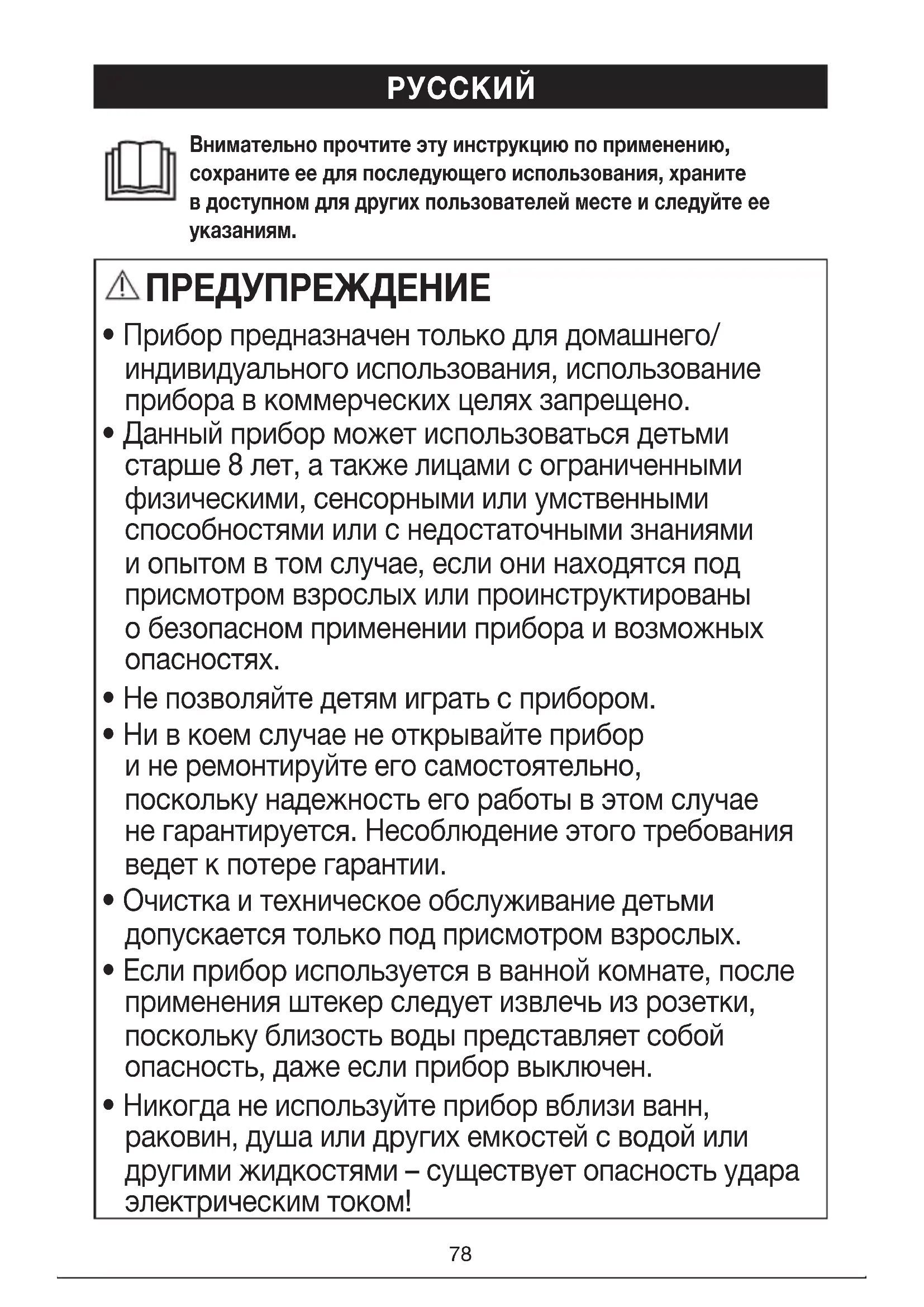 Прибор не должен использоваться вблизи воды или вводе (например, враковине, душе, ванне) — опасность удара током! ПРЕДУПРЕЖДЕНИЕ Предупреждает обопасности травмирования или нанесения вреда здоровью