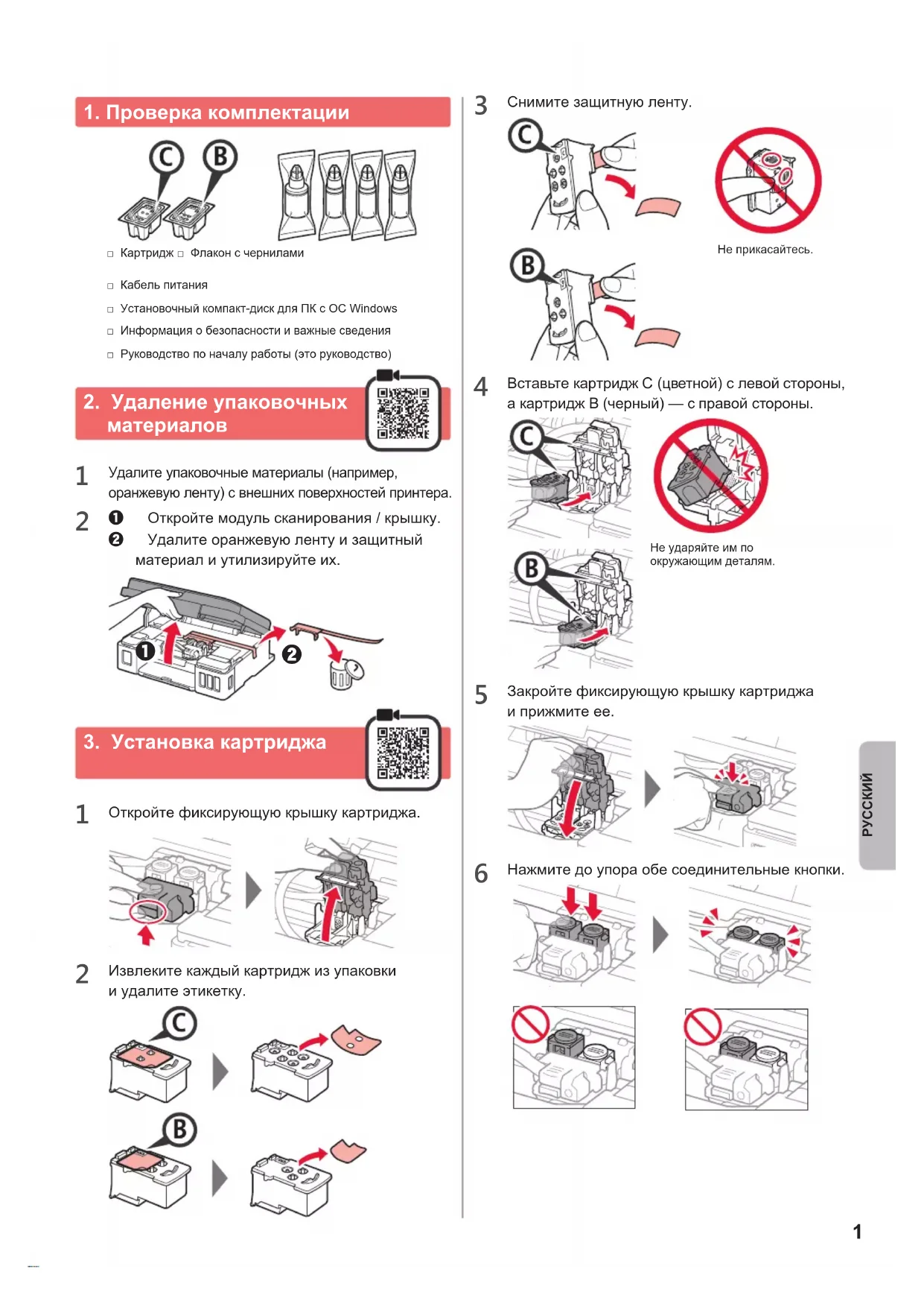 □ Информация о безопасности и важные сведения □ Кабель питания □ Установочный компакт-диск для ПК с ОС Windows □ Руководство по началу работы )это руководство( □ Картридж □ Флакон с чернилами