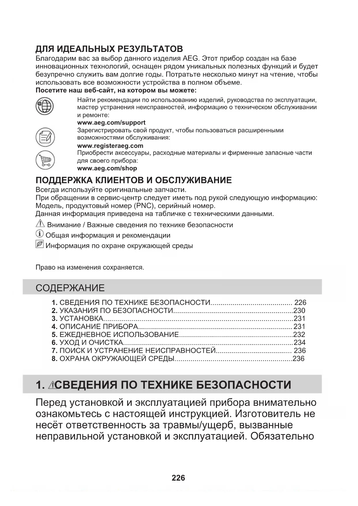 Reciclaţi materialele marcate cu simbolul . Pentru a recicla ambalajele, acestea trebuie puse în containerele corespunzătoare. Ajutaţi la protejarea mediului şi a sănătăţii umane şi la reciclarea deşeurilor din aparatele electrice şi electrocasnice. Nu aruncaţi aparatele marcate cu acest simbol împreună cu deşeurile menajere. Returnaţi produsul la centrul local de reciclare sau contactaţi administraţia oraşului dvs. 225ДЛЯ ИДЕАЛЬНЫХ РЕЗУЛЬТАТОВ Благодарим вас за выбор данного изделия AEG. Этот прибор создан на базеинновационных технологий, оснащен рядом уникальных полезных функций и будетбезупречно служить вам долгие годы. Потратьте несколько минут на чтение, чтобыиспользовать все возможности устройства в полном объеме.Посетите наш веб-сайт, на котором вы можете:Найти рекомендации по использованию изделий, руководства по эксплуатации,мастер устранения неисправностей, информацию о техническом обслуживаниии ремонте:www.aeg.com/supportЗарегистрировать свой продукт, чтобы пользоваться расширеннымивозможностями обслуживания:www.registeraeg.comПриобрести аксессуары, расходные материалы и фирменные запасные частидля своего прибора:www.aeg.com/shop ПОДДЕРЖКА КЛИЕНТОВ И ОБСЛУЖИВАНИЕ Всегда используйте оригинальные запчасти.При обращении в сервис-центр следует иметь под рукой следующую информацию:Модель, продуктовый номер (PNC), серийный номер.Данная информация приведена на табличке с техническими данными. Внимание / Важные сведения по технике безопасности Общая информация и рекомендации Информация по охране окружающей средыПраво на изменения сохраняется. 1. СВЕДЕНИЯ ПО ТЕХНИКЕ БЕЗОПАСНОСТИ......................................... 2262. УКАЗАНИЯ ПО БЕЗОПАСНОСТИ............................................................230