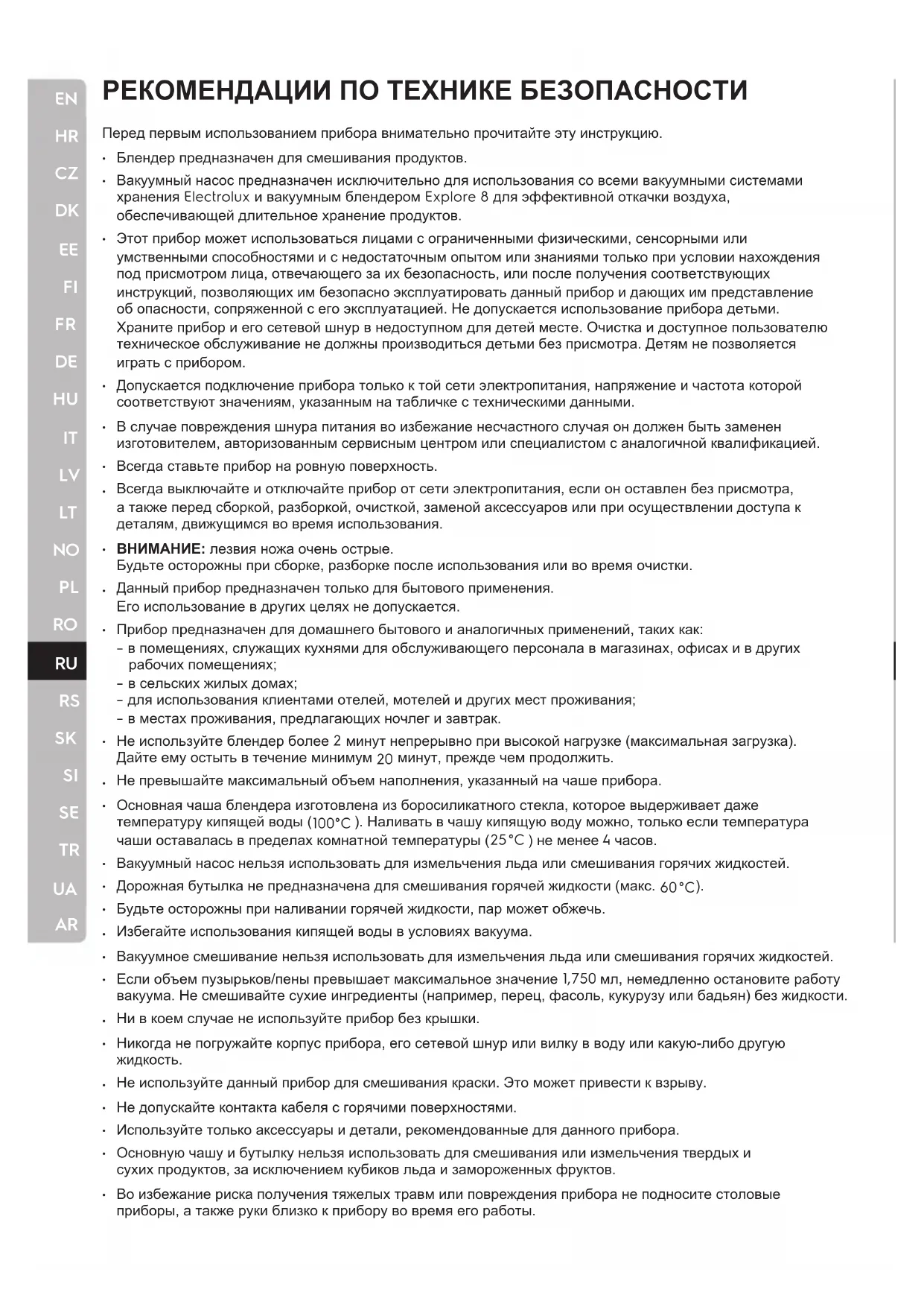 Блендер предназначен для смешивания продуктов. Вакуумный насос предназначен исключительно для использования со всеми вакуумными системами хранения Electrolux и вакуумным блендером Explore 8 для эффективной откачки воздуха, обеспечивающей длительное хранение продуктов. Этот прибор может использоваться лицами с ограниченными физическими, сенсорными или умственными способностями и с недостаточным опытом или знаниями только при условии нахождения под присмотром лица, отвечающего за их безопасность, или после получения соответствующих инструкций, позволяющих им безопасно эксплуатировать данный прибор и дающих им представление об опасности, сопряженной с его эксплуатацией. Не допускается использование прибора детьми. Храните прибор и его сетевой шнур в недоступном для детей месте. Очистка и доступное пользователю техническое обслуживание не должны производиться детьми без присмотра. Детям не позволяется играть с прибором. Допускается подключение прибора только к той сети электропитания, напряжение и частота которой соответствуют значениям, указанным на табличке с техническими данными. В случае повреждения шнура питания во избежание несчастного случая он должен быть заменен изготовителем, авторизованным сервисным центром или специалистом с аналогичной квалификацией. Всегда ставьте прибор на ровную поверхность. Всегда выключайте и отключайте прибор от сети электропитания, если он оставлен без присмотра, а также перед сборкой, разборкой, очисткой, заменой аксессуаров или при осуществлении доступа к деталям, движущимся во время использования. ВНИМАНИЕ: лезвия ножа очень острые. Будьте осторожны при сборке, разборке после использования или во время очистки. Данный прибор предназначен только для бытового применения. Его использование в других целях не допускается. Прибор предназначен для домашнего бытового и аналогичных применений, таких как: – в помещениях, служащих кухнями для обслуживающего персонала в магазинах, офисах и в других рабочих помещениях; – в сельских жилых домах; – для использования клиентами отелей, мотелей и других мест проживания; – в местах проживания, предлагающих ночлег и завтрак. Не используйте блендер более