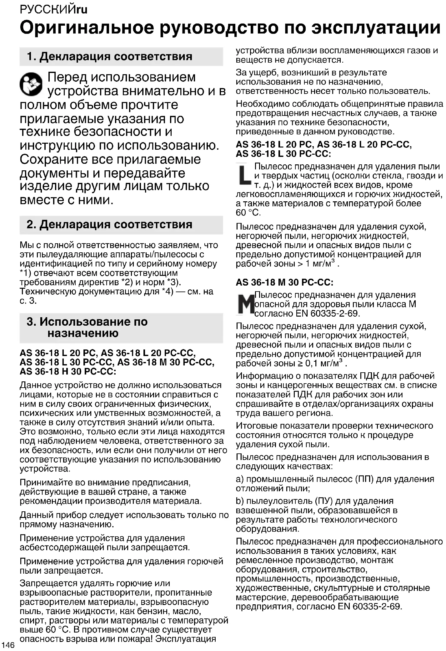 Оригинальное руководство по эксплуатации Перед использованием устройства внимательно и в полном объеме прочтите прилагаемые указания по технике безопасности и инструкцию по использованию. Сохраните все прилагаемые документы и передавайте изделие другим лицам только вместе с ними. Мы с полной ответственностью заявляем, что эти пылеудаляющие аппараты/пылесосы с идентификацией по типу и серийному номеру *1) отвечают всем соответствующим требованиям директив *2) и норм *3). Техническую документацию для *4) — см. на с. 3. AS 36-18 L 20 PC, AS 36-18 L 20 PC-CC, AS 36-18 L 30 PC-CC, AS 36-18 M 30 PC-CC, AS 36-18 H 30 PC-CC: Данное устройство не должно использоваться лицами, которые не в состоянии справиться с ним в силу своих ограниченных физических, психических или умственных возможностей, а также в силу отсутствия знаний и/или опыта. Это возможно, только если эти лица находятся под наблюдением человека, ответственного за их безопасность, или если они получили от него соответствующие указания по использованию устройства. Принимайте во внимание предписания, действующие в вашей стране, а также рекомендации производителя материала. Данный прибор следует использовать только по прямому назначению. Применение устройства для удаления асбестсодержащей пыли запрещается. Применение устройства для удаления горючей пыли запрещается. Запрещается удалять горючие или взрывоопасные растворители, пропитанные растворителем материалы, взрывоопасную пыль, такие жидкости, как бензин, масло, спирт, растворы или материалы с температурой выше 60 °C. В противном случае существует опасность взрыва или пожара! Эксплуатация устройства вблизи воспламеняющихся газов и веществ не допускается. За ущерб, возникший в результате использования не по назначению, ответственность несет только пользователь. Необходимо соблюдать общепринятые правила предотвращения несчастных случаев, а также указания по технике безопасности, приведенные в данном руководстве. AS 36-18 L 20 PC, AS 36-18 L 20 PC-CC, AS 36-18 L 30 PC-CC: Пылесос предназначен для удаления пыли и твердых частиц (осколки стекла, гвозди и т. д.) и жидкостей всех видов, кроме легковоспламеняющихся и горючих жидкостей, а также материалов с температурой более 60 °C. Пылесос предназначен для удаления сухой, негорючей пыли, негорючих жидкостей, древесной пыли и опасных видов пыли с предельно допустимой концентрацией для рабочей зоны > 1 мг/м³ . AS 36-18 M 30 PC-CC: Пылесос предназначен для удаления опасной для здоровья пыли класса M согласно EN 60335-2-69. Пылесос предназначен для удаления сухой, негорючей пыли, негорючих жидкостей, древесной пыли и опасных видов пыли с предельно допустимой концентрацией для рабочей зоны ≥ 0,1 мг/м³ . Информацию о показателях ПДК для рабочей зоны и канцерогенных веществах см. в списке показателей ПДК для рабочих зон или спрашивайте в отделах/организациях охраны труда вашего региона. Итоговые показатели проверки технического состояния относятся только к процедуре удаления сухой пыли. Пылесос предназначен для использования в следующих качествах: a) промышленный пылесос (ПП) для удаления отложений пыли; b) пылеуловитель (ПУ) для удаления взвешенной пыли, образовавшейся в результате работы технологического оборудования. Пылесос предназначен для профессионального использования в таких условиях, как ремесленное производство, монтаж оборудования, строитель