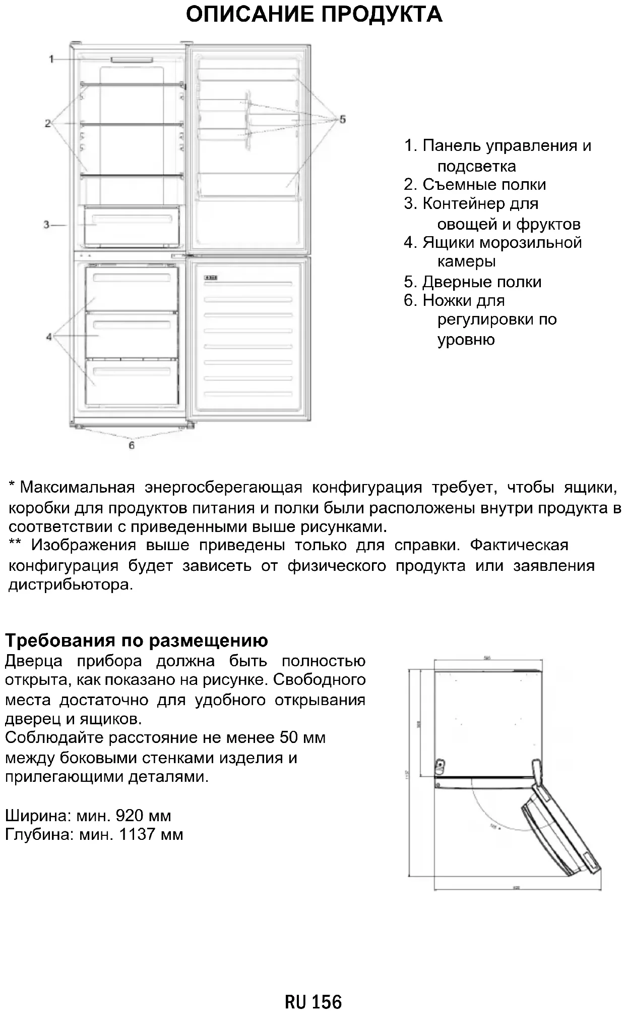 - Максимальная энергосберегающая конфигурация требует, чтобы ящики, коробки для продуктов питания и полки были расположены внутри продукта в соответствии с приведенными выше рисунками. ** Изображения выше приведены только для справки. Фактическая конфигурация будет зависеть от физического продукта или заявления дистрибьютора. Требования по размещению Дверца прибора должна быть полностью открыта, как показано на рисунке. Свободного места достаточно для удобного открывания дверец и ящиков. Соблюдайте расстояние не менее 50 мм между боковыми стенками изделия и прилегающими деталями. Ширина: мин. 920 мм Глубина: мин. 1137 ммИСПОЛЬЗОВАНИЕ ➀ Кнопка ВКЛ/ВЫКЛ, используемая для включения/выключения прибора. ➁ Кнопка Mode, используемая для выбора температуры холодильного отсека или специальных функций. ➂ Значок Wi-Fi показывает, подключено ли устройство к приложению. ➃ Значок Super Cool показывает, активирована ли функция. ➄ Уровни температуры, показывающие, какая температура выбрана. Использование