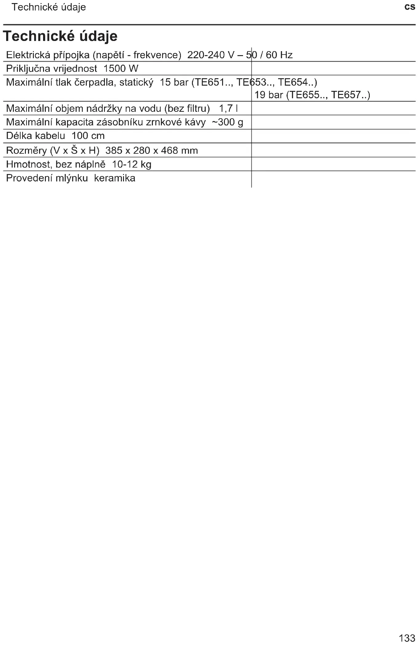 Номера телефонов указаны на последних страницах инструкции. Технические характеристики Электрическоеподключение (напряжение–частота) 220-240В–50/60Гц Потребляемаямощность 1500Вт Максимальноедавлениенасоса,статическое 15бар(TE651..,TE653..,TE654..) 19бар(TE655..,TE657..) Максимальнаявместимостьконтейнерадляводы (безфильтра) 1,7л Максимальнаявместимостьемкостидля кофейныхзерен ~300г Длинасетевогокабеля 100см Размеры(ВхШхГ) 385x280x468мм Вес,порожний 10-12кг Видкофемолки Керамика162
