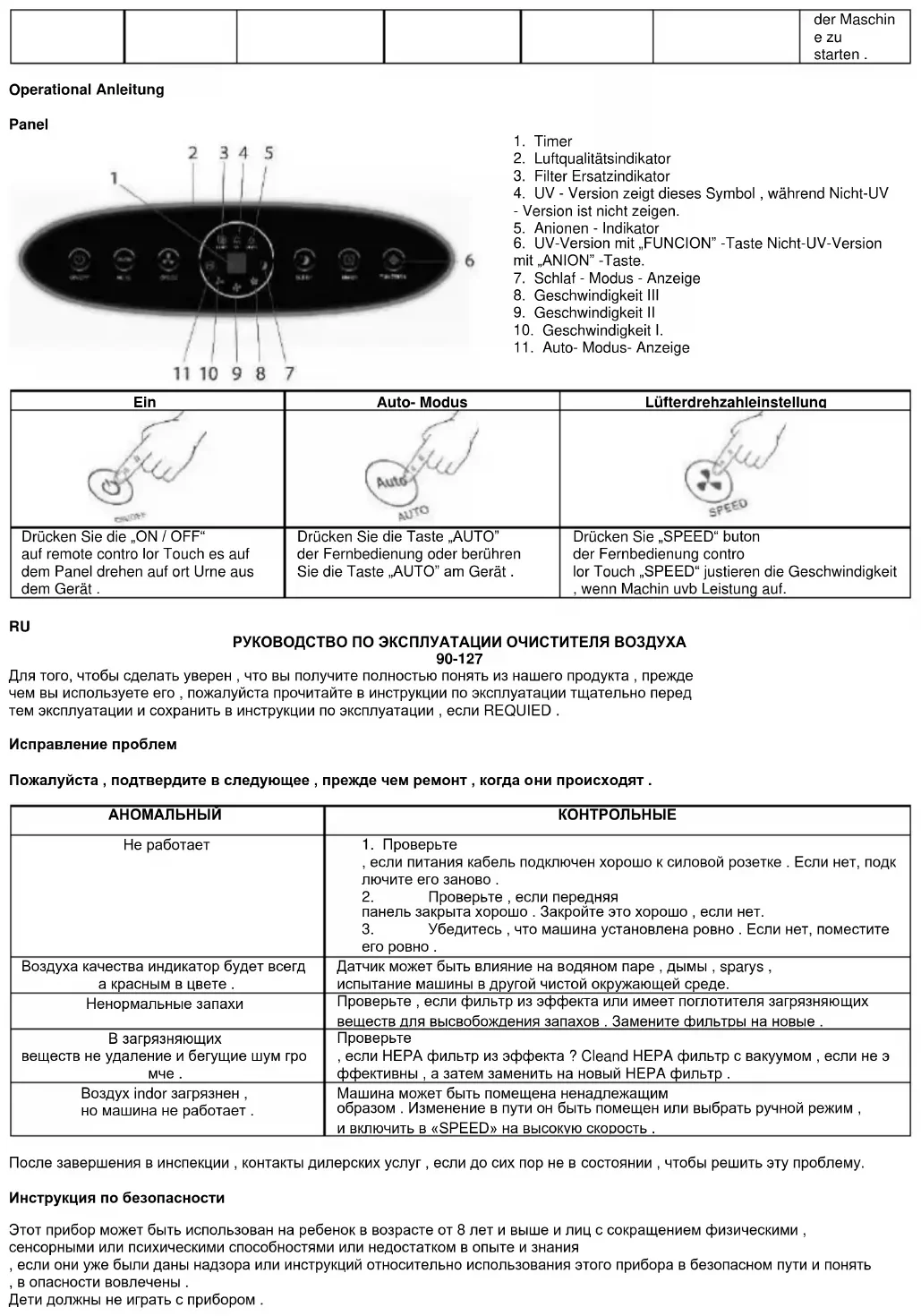 РУКОВОДСТВО ПО ЭКСПЛУАТАЦИИ ОЧИСТИТЕЛЯ ВОЗДУХА 90-127 Для того, чтобы сделать уверен , что вы получите полностью понять из нашего продукта , прежде чем вы используете его , пожалуйста прочитайте в инструкции по эксплуатации тщательно перед тем эксплуатации и сохранить в инструкции по эксплуатации , если REQUIED . Исправление проблем Пожалуйста , подтвердите в следующее , прежде чем ремонт , когда они происходят .