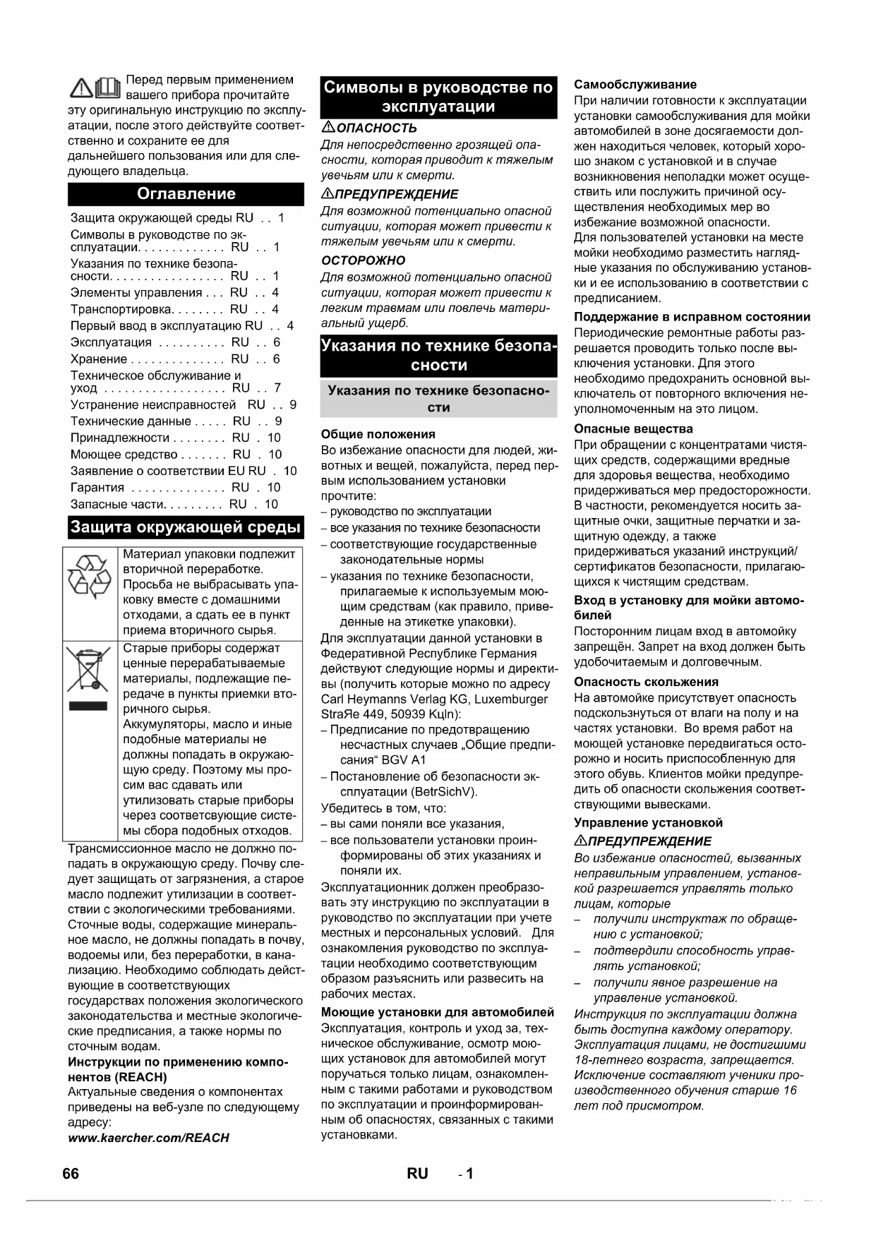 Поддержание в исправном состоянии 67RU- 3 Надежность состояния данной моющей установки должна проверяться специа- листом перед первым вводом в эксплуа- тацию и впоследствии как минимум через каждые полгода. Эта проверка в частности включает в себя: – Визуальную проверку на внешне за- метный износ или повреждение – Функциональную проверку – Ежедневно перед началом работы целостность и эффективность за- щитных устройств на установках с самообслуживанием, на установках с наблюдением, по необходимости, но как минимум раз в месяц. Используйте только оригинальные или рекомендованные изготовителем запа- сные части, поскольку в противном слу- чае теряется право на гарантийное обслуживание. Соблюдайте все указа- ния по безопасности и применению, ко- торыми сопровождаются такие части. Это распространяется на: – Запасные и изнашиваемые части – Гарнитуры – Эксплуатационные материалы – Моющее средство.
