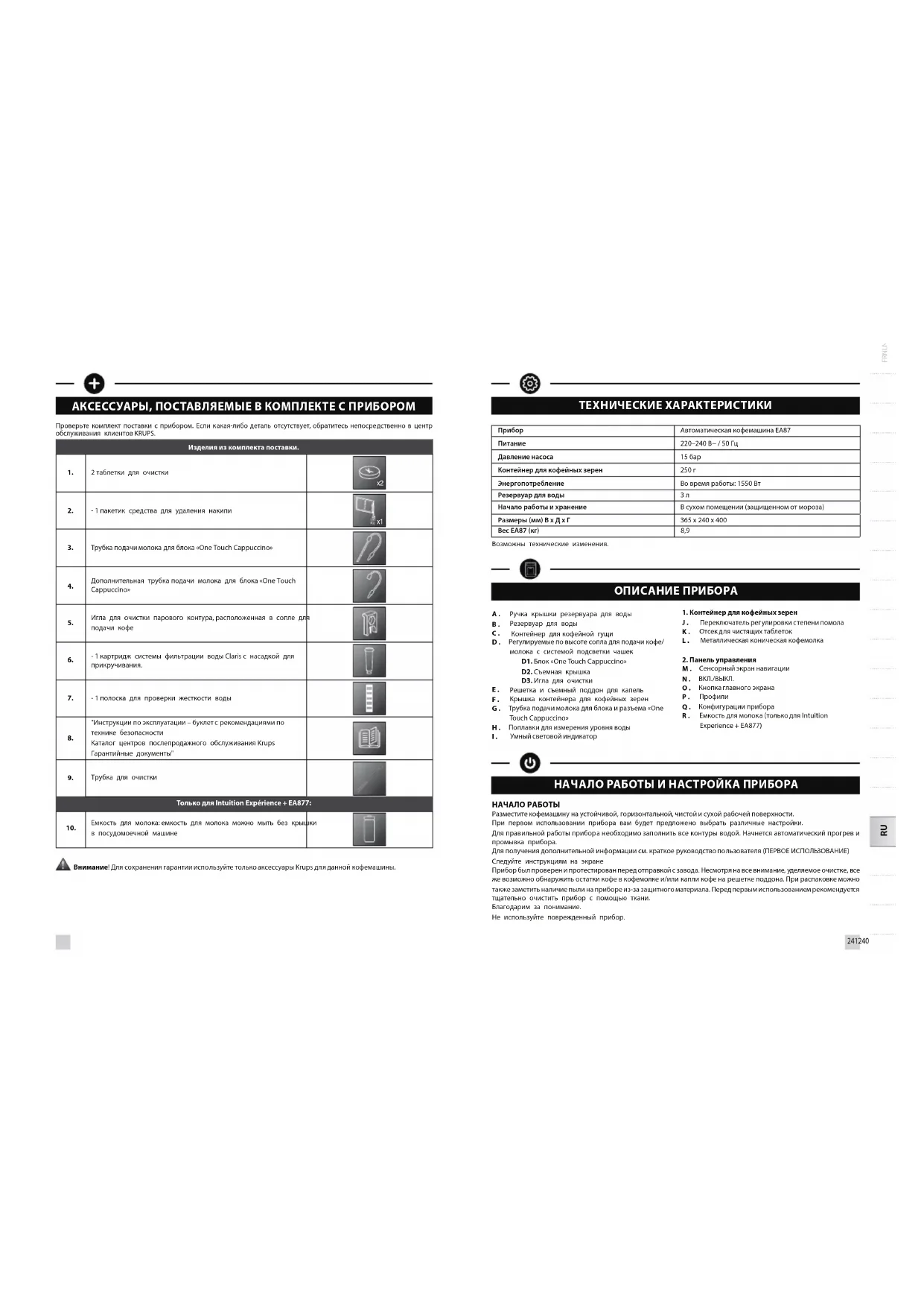 ВАЖНАЯ ИНФОРМАЦИЯ О ПРОДУКТЕ Перед первым использованием прибора внимательно прочитайте инструкцию по эксплуатации и брошюру «Инструкции по технике безопасности» и сохраните ее: неправильное использование снимает с компании KRUPS любую ответственность.241240