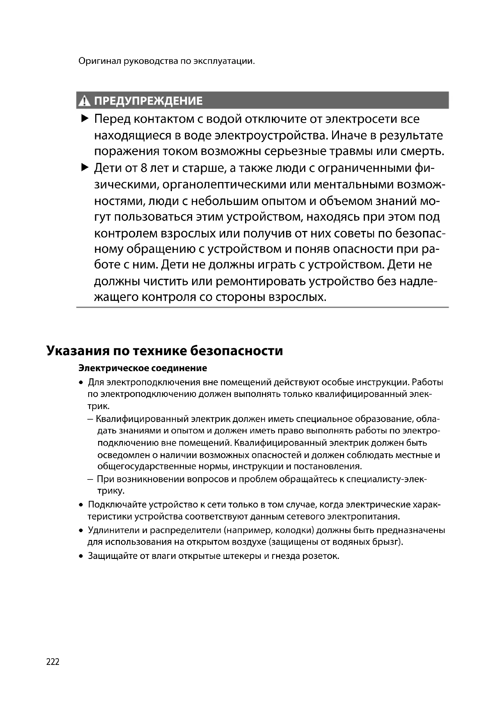 ПРЕДУПРЕЖДЕНИЕ Перед контактом с водой отключите от электросети все находящиеся в воде электроустройства. Иначе в результате поражения током возможны серьезные травмы или смерть. Дети от 8 лет и старше, а также люди с ограниченными фи- зическими, органолептическими или ментальными возмож- ностями, люди с небольшим опытом и объемом знаний мо- гут пользоваться этим устройством, находясь при этом под контролем взрослых или получив от них советы по безопас- ному обращению с устройством и поняв опасности при ра- боте с ним. Дети не должны играть с устройством. Дети не должны чистить или ремонтировать устройство без надле- жащего контроля со стороны взрослых.