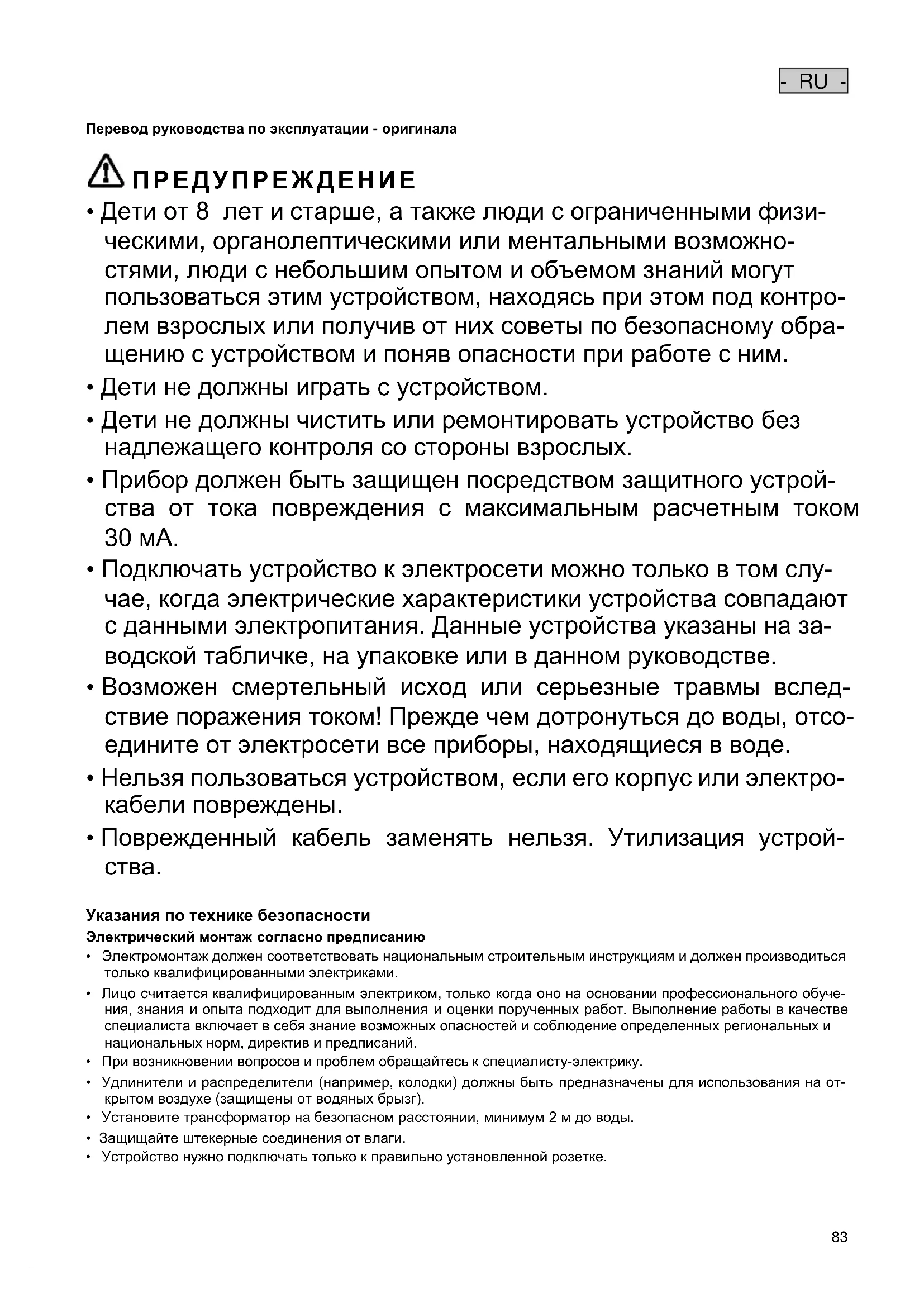 - Возможен смертельный исход или серьезные травмы вслед- ствие поражения током! Прежде чем дотронуться до воды, отсо- едините от электросети все приборы, находящиеся в воде.