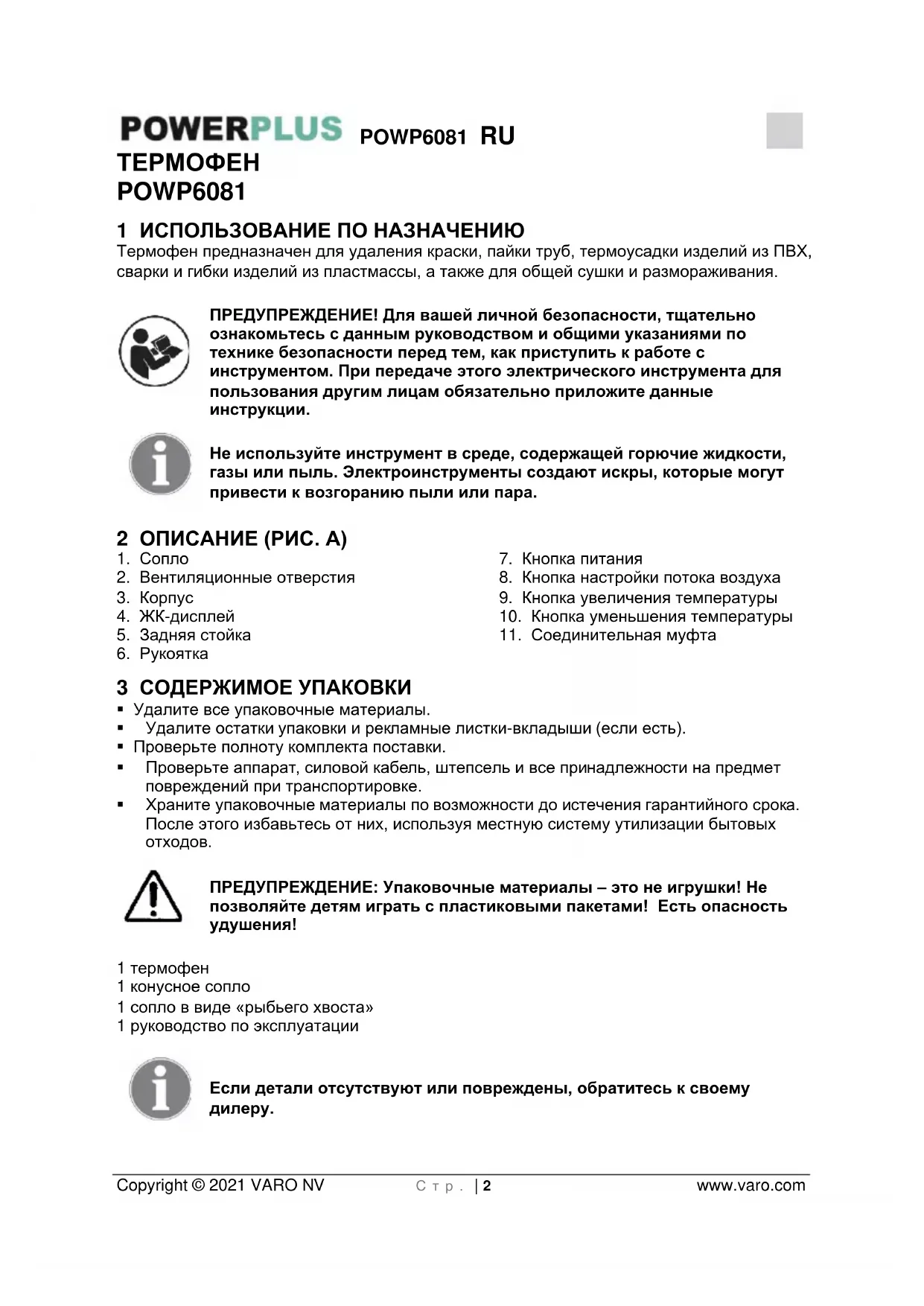 - Из гарантии определенно исключается повреждение, возникающее вследствие проникновения жидкости, сильного запыления, умышленного повреждения (преднамеренно или по грубой небрежности), неправильной эксплуатации (использование устройства не по назначению), неправомочного использования (например, несоблюдения инструкций, приведенных в руководстве), неквалифицированной сборки, разряда молнии, неправильного напряжения сети. Данный список не является исчерпывающим.POWP6081 RU Copyright © 2021 VARO NV С т р . | 11 www.varo.com