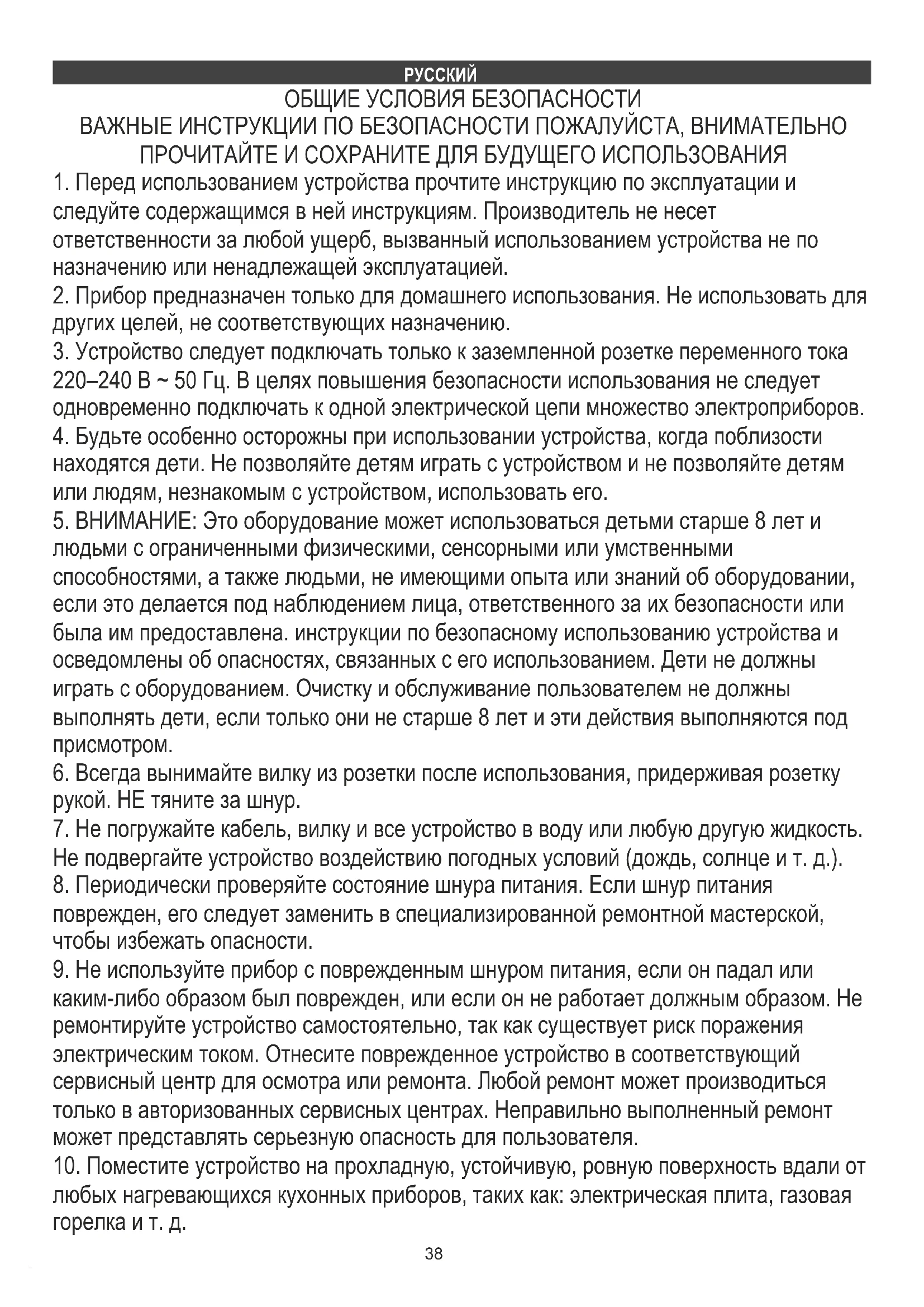 7. Не погружайте кабель, вилку и все устройство в воду или любую другую жидкость.
