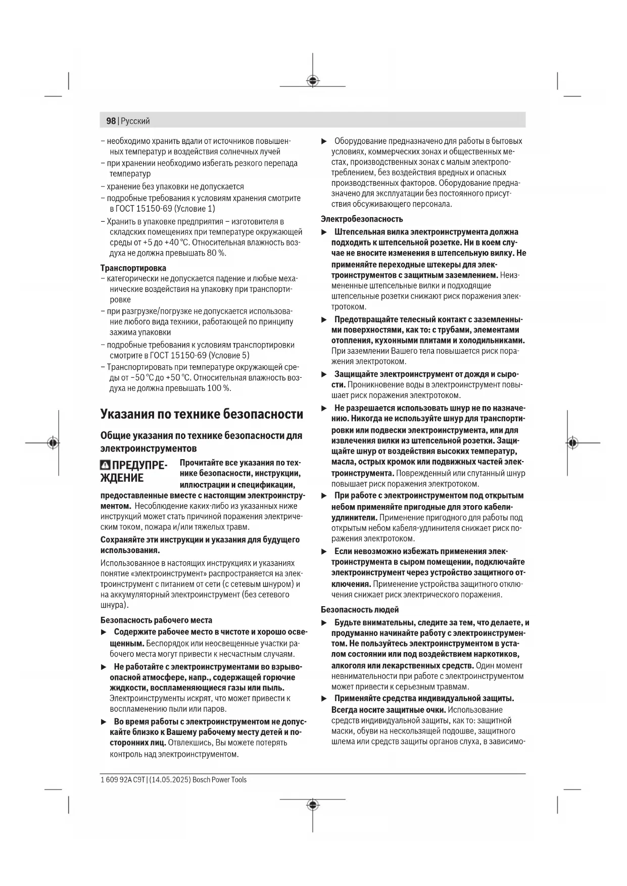 – необходимо хранить в сухом месте Bosch Power Tools 1 609 92A C9T | (14.05.2025)98 | Русский – необходимо хранить вдали от источников повышен- ных температур и воздействия солнечных лучей – при хранении необходимо избегать резкого перепада