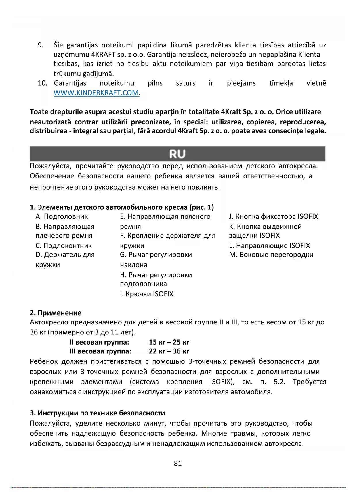 WWW.KINDERKRAFT.COM. Toate drepturile asupra acestui studiu aparțin în totalitate 4Kraft Sp. z o. o. Orice utilizare neautorizată contrar utilizării preconizate, în special: utilizarea, copierea, reproducerea, distribuirea - integral sau parțial, fără acordul 4Kraft Sp. z o. o. poate avea consecințe legale. Пожалуйста, прочитайте руководство перед использованием детского автокресла. Обеспечение безопасности вашего ребенка является вашей ответственностью, а непрочтение этого руководства может на него повлиять.