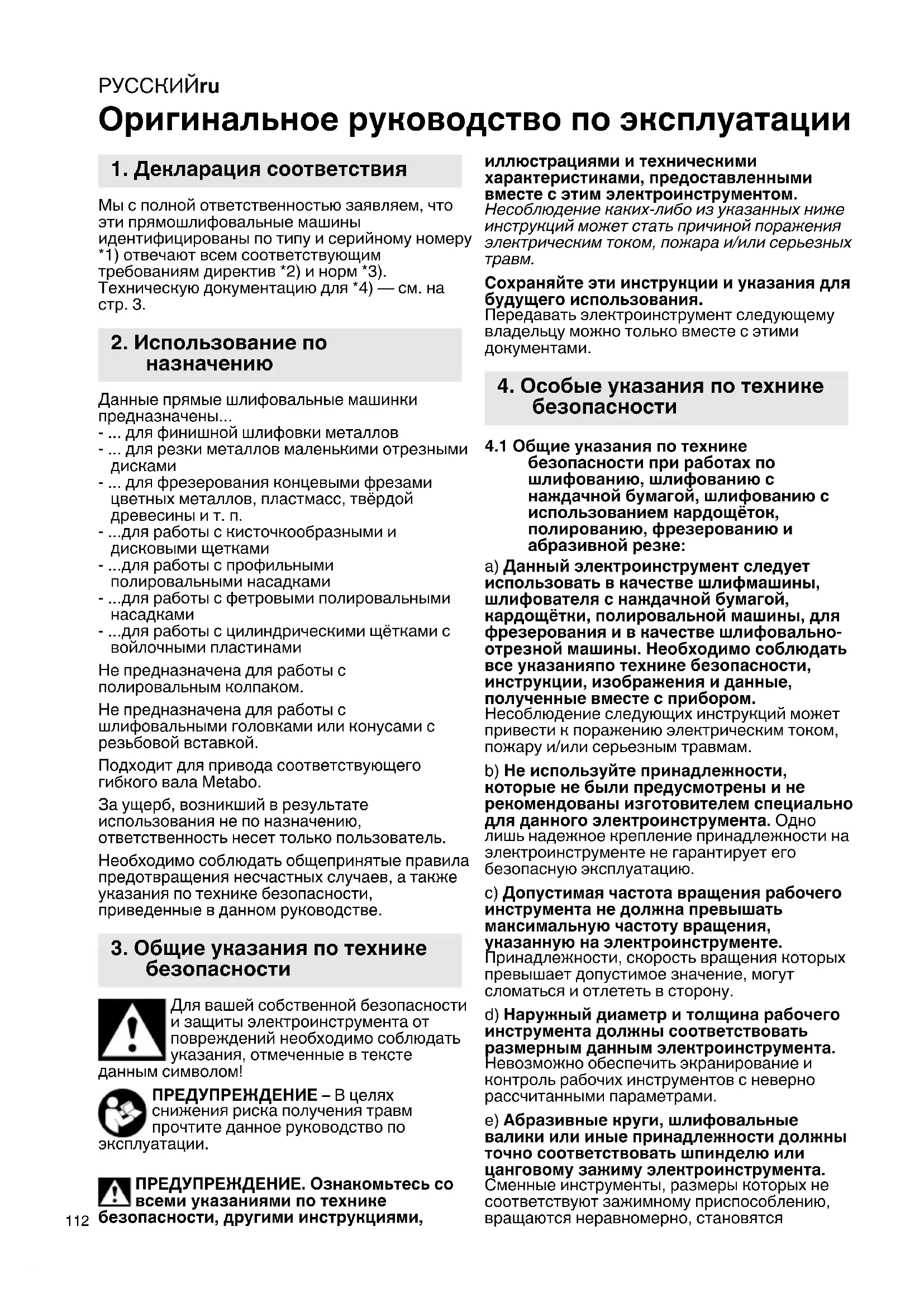 Оригинальное руководство по эксплуатации Мы с полной ответственностью заявляем, что эти прямошлифовальные машины идентифицированы по типу и серийному номеру *1) отвечают всем соответствующим требованиям директив *2) и норм *3). Техническую документацию для *4) — см. на стр. 3. Данные прямые шлифовальные машинки предназначены... - ... для финишной шлифовки металлов - ... для резки металлов маленькими отрезными