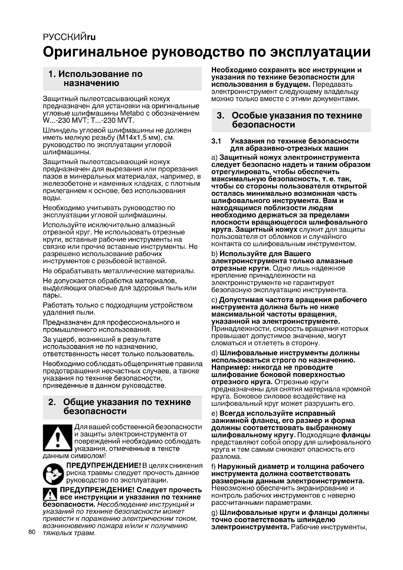 Оригинальное руководство по эксплуатации Защитный пылеотсасывающий кожух предназначен для установки на оригинальные угловые шлифмашины Metabo с обозначением W...-230 MVT; T...-230 MVT. Шпиндель угловой шлифмашины не должен иметь мелкую резьбу (M14x1,5 мм), см. руководство по эксплуатации угловой шлифмашины. Защитный пылеотсасывающий кожух предназначен для вырезания или прорезания пазов в минеральных материалах, например, в железобетоне и каменных кладках, с плотным прилеганием к основе, без использования