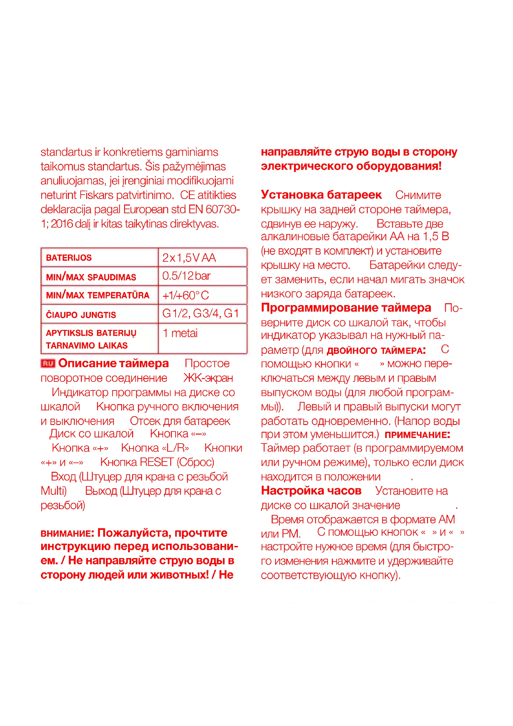 внимание: Пожалуйста, прочтите инструкцию перед использовани- ем. / Не направляйте струю воды в сторону людей или животных! / Не направляйте струю воды в сторону электрического оборудования! Установка батареек 1.Снимите крышку на задней стороне таймера, сдвинув ее наружу. 2.Вставьте две алкалиновые батарейки АА на 1,5 В (не входят в комплект) и установите крышку на место. 3.Батарейки следу- ет заменить, если начал мигать значок низкого заряда батареек. Программирование таймера 1.По- верните диск со шкалой так, чтобы индикатор указывал на нужный па- раметр (для двойного таймера: 2.С помощью кнопки « L/R» можно пере- ключаться между левым и правым выпуском воды (для любой програм-