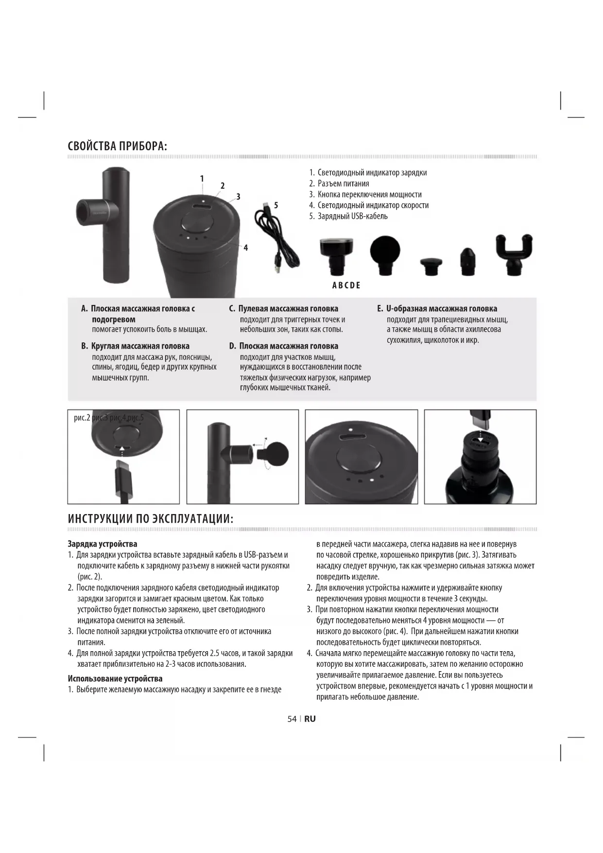которую вы хотите массажировать, затем по желанию осторожно увеличивайте прилагаемое давление. Если вы пользуетесь устройством впервые, рекомендуется начать с 1 уровня мощности и прилагать небольшое давление. СВОЙСТВА ПРИБОРА: 54 I RU ИНСТРУКЦИИ ПО ЭКСПЛУАТАЦИИ: рис.2 рис.3 рис.4 рис.5