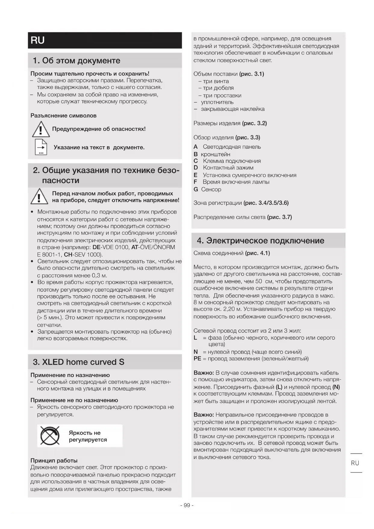 - Запрещается монтировать прожектор на (обычно) легко возгораемых поверхностях. 3 XLED home curved S Применение по назначению – Сенсорный светодиодный светильник для настен- ного монтажа на улицах и в помещениях Применение не по назначению – Яркость сенсорного светодиодного прожектора не регулируется. Яркость не регулируетсяПринцип работы Движение включает свет. Этот прожектор с произ- вольно поворачиваемой панелью прекрасно подходит для использования в частных владениях для осве- щения дома или прилегающего пространства, также