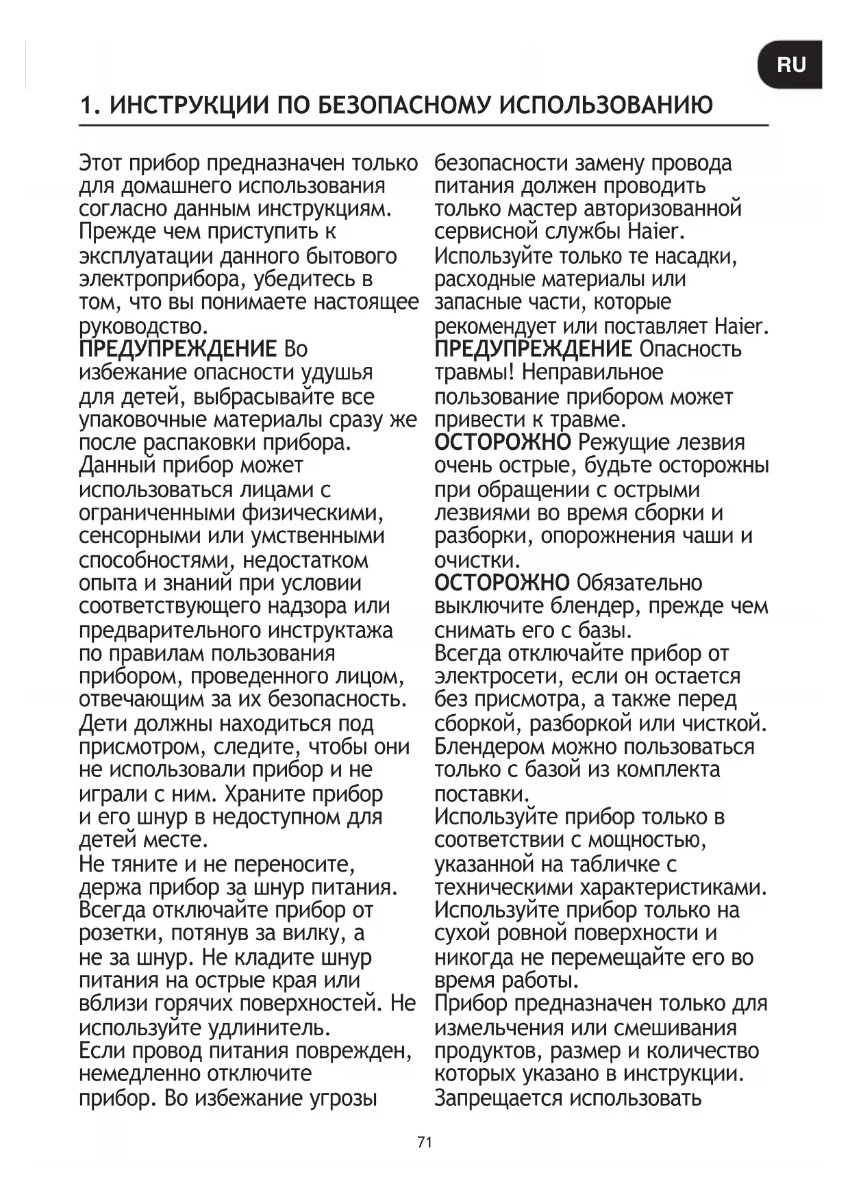 - Älä huoli, jos nestettä pääsee päärunkoon, sillä sen sisällä on tyhjennyssäiliö. FI71 Этот прибор предназначен только для домашнего использования согласно данным инструкциям. Прежде чем приступить к эксплуатации данного бытового электроприбора, убедитесь в том, что вы понимаете настоящее руководство. ПРЕДУПРЕЖДЕНИЕ Во избежание опасности удушья для детей, выбрасывайте все упаковочные материалы сразу же после распаковки прибора. Данный прибор может использоваться лицами с ограниченными физическими, сенсорными или умственными способностями, недостатком опыта и знаний при условии соответствующего надзора или предварительного инструктажа по правилам пользования прибором, проведенного лицом, отвечающим за их безопасность. Дети должны находиться под присмотром, следите, чтобы они не использовали прибор и не играли с ним. Храните прибор и его шнур в недоступном для детей месте. Не тяните и не переносите, держа прибор за шнур питания. Всегда отключайте прибор от розетки, потянув за вилку, а не за шнур. Не кладите шнур питания на острые края или вблизи горячих поверхностей. Не используйте удлинитель. Если провод питания поврежден, немедленно отключите прибор. Во избежание угрозы безопасности замену провода питания должен проводить только мастер авторизованной сервисной службы Haier. Используйте только те насадки, расходные материалы или запасные части, которые рекомендует или поставляет Haier. ПРЕДУПРЕЖДЕНИЕ Опасность травмы! Неправильное пользование прибором может привести к травме. ОСТОРОЖНО Режущие лезвия очень острые, будьте осторожны при обращении с острыми лезвиями во время сборки и разборки, опорожнения чаши и