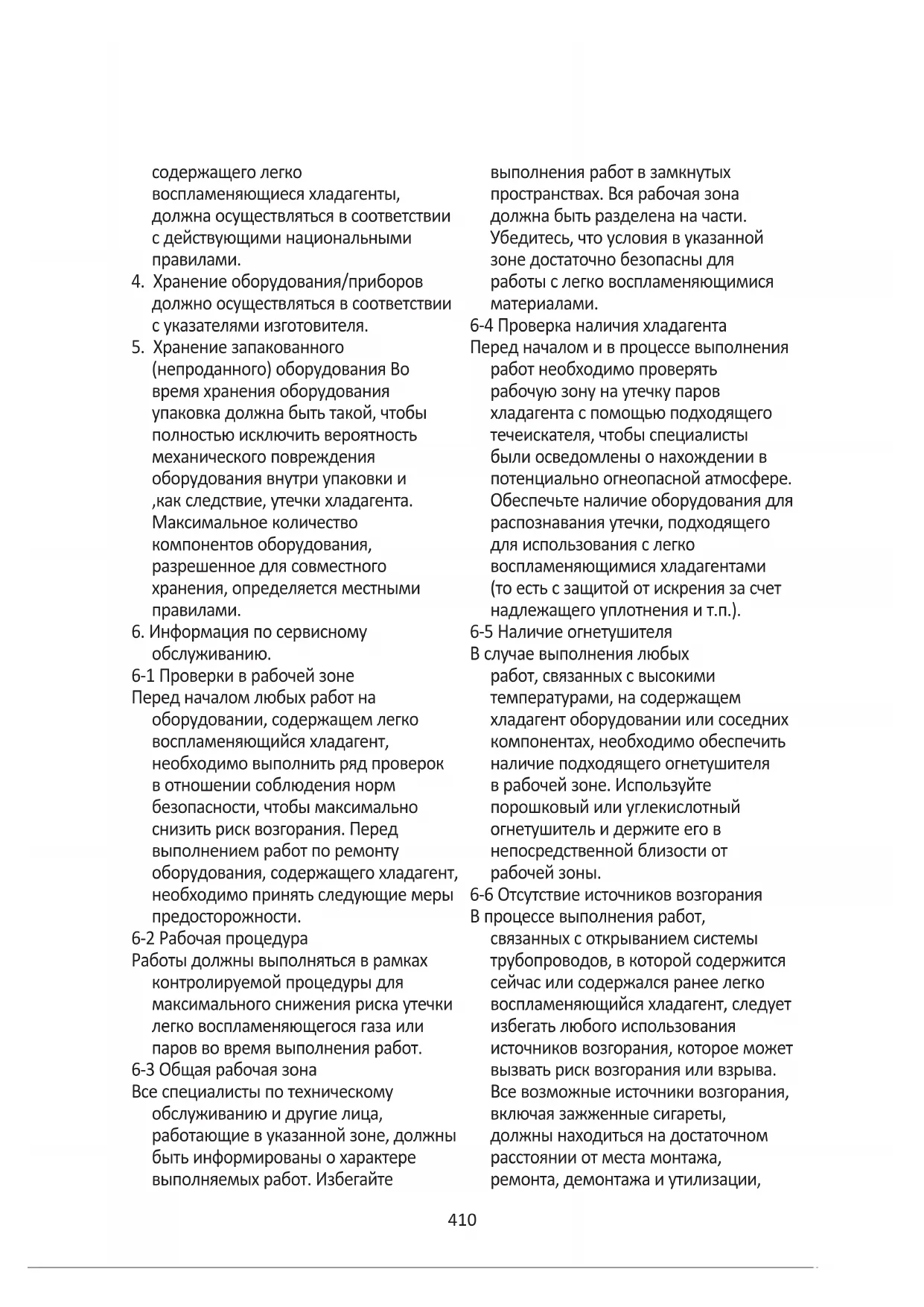 обслуживанию. 6-1 Проверки в рабочей зоне Перед началом любых работ на оборудовании, содержащем легко воспламеняющийся хладагент, необходимо выполнить ряд проверок в отношении соблюдения норм безопасности, чтобы максимально снизить риск возгорания. Перед выполнением работ по ремонту оборудования, содержащего хладагент, необходимо принять следующие меры предосторожности. 6-2 Рабочая процедура Работы должны выполняться в рамках контролируемой процедуры для максимального снижения риска утечки легко воспламеняющегося газа или паров во время выполнения работ. 6-3 Общая рабочая зона Все специалисты по техническому обслуживанию и другие лица, работающие в указанной зоне, должны быть информированы о характере выполняемых работ. Избегайте выполнения работ в замкнутых пространствах. Вся рабочая зона должна быть разделена на части. Убедитесь, что условия в указанной зоне достаточно безопасны для работы с легко воспламеняющимися материалами. 6-4 Проверка наличия хладагента Перед началом и в процессе выполнения работ необходимо проверять рабочую зону на утечку паров хладагента с помощью подходящего течеискателя, чтобы специалисты были осведомлены о нахождении в потенциально огнеопасной атмосфере. Обеспечьте наличие оборудования для распознавания утечки, подходящего для использования с легко воспламеняющимися хладагентами (то есть с защитой от искрения за счет надлежащего уплотнения и т.п.). 6-5 Наличие огнетушителя В случае выполнения любых работ, связанных с высокими температурами, на содержащем хладагент оборудовании или соседних компонентах, необходимо обеспечить наличие подходящего огнетушителя в рабочей зоне. Используйте порошковый или углекислотный огнетушитель и держите его в непосредственной близости от рабочей зоны. 6-6 Отсутствие источников возгорания В процессе выполнения работ, связанных с открыванием системы трубопроводов, в которой содержится сейчас или содержался ранее легко воспламеняющийся хладагент, следует избегать любого использования источников возгорания, которое может вызвать риск возгорания или взрыва. Все возможные источники возгорания, включая зажженные сигареты, должны находиться на достаточном расстоянии от места монтажа, ремонта, демонтажа и утилизации,411 так как в процессе выполнения этих работ возможен выход хладагента в окружающую атмосферу. Перед началом работ необходимо осмотреть рабочую зону вокруг оборудования и убедиться в отсутствии источников и рисков возгорания. Также необходимо разместить в рабочей зоне таблички "Не курить". 6-7 Наличие вентиляции Перед началом работ на оборудовании, в особенности работ, связанных с высокими температурами, убедитесь, что рабочая зона находится на улице или хорошо проветривается. Хорошая вентиляция должна сохраняться в течение всего времени выполнения работ. Вентиляция должна обеспечивать безопасное рассеивание паров хладагента и, в идеале, отведение их в атмосферу. 6-8 Проверки содержащего хладагент оборудования В случае замены электрических компонентов необходимо обеспечить их соответствие существующим целям и техническим характеристикам. В любом случае строго соблюдайте указания по сервисному и техническому обслуживанию, предусмотренные изготовителем. При возникновении сомнений обращайтесь за помощью в технический отде