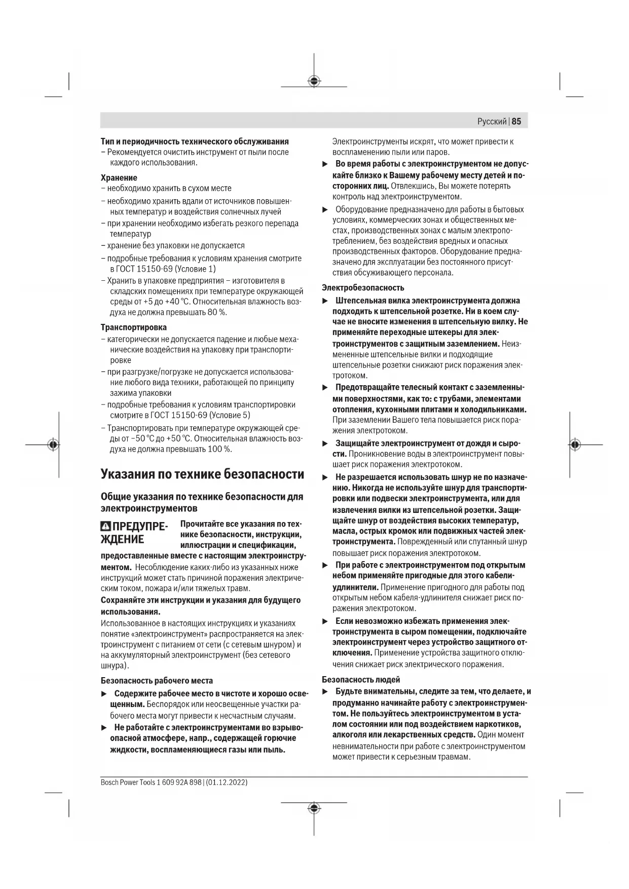 – не включать при попадании воды в корпус Критерии предельных состояний – перетёрт или повреждён электрический кабель – поврежден корпус изделия 1 609 92A 898 | (01.12.2022) Bosch Power ToolsРусский | 85 Тип и периодичность технического обслуживания – Рекомендуется очистить инструмент от пыли после каждого использования.