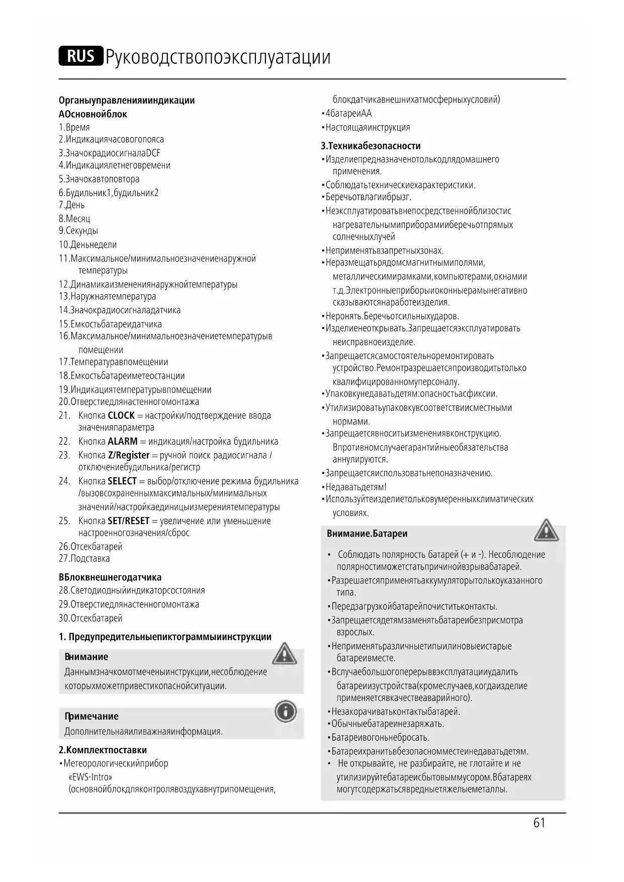 - Израсходованные батареи немедленно удалять из прибора и утилизировать.