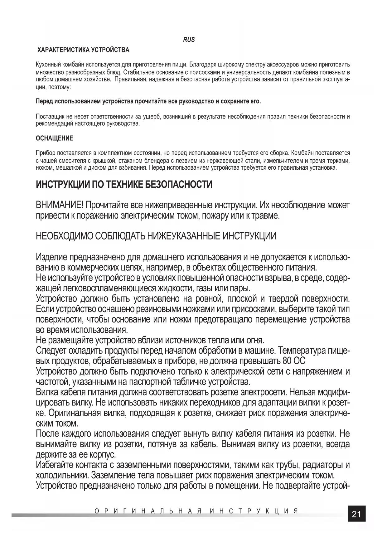 Прибор поставляется в комплектном состоянии, но перед использованием требуется его сборка. Комбайн поставляется с чашей смесителя с крышкой, стаканом блендера с лезвием из нержавеющей стали, измельчителем и тремя терками, ножом, мешалкой и диском для взбивания. Перед использованием устройства требуется его правильная установка. ИНСТРУКЦИИ ПО ТЕХНИКЕ БЕЗОПАСНОСТИ ВНИМАНИЕ! Прочитайте все нижеприведенные инструкции. Их несоблюдение может привести к поражению электрическим током, пожару или к травме. НЕОБХОДИМО СОБЛЮДАТЬ НИЖЕУКАЗАННЫЕ ИНСТРУКЦИИ Изделие предназначено для домашнего использования и не допускается к использо- ванию в коммерческих целях, например, в объектах общественного питания. Не используйте устройство в условиях повышенной опасности взрыва, в среде, содер- жащей легковоспламеняющиеся жидкости, газы или пары. Устройство должно быть установлено на ровной, плоской и твердой поверхности. Если устройство оснащено резиновыми ножками или присосками, выберите такой тип поверхности, чтобы основание или ножки предотвращало перемещение устройства во время использования. Не размещайте устройство вблизи источников тепла или огня. Следует охладить продукты перед началом обработки в машине. Температура пище- вых продуктов, обрабатываемых в приборе, не должна превышать 80 OC Устройство должно быть подключено только к электрической сети с напряжением и частотой, указанными на паспортной табличке устройства. Вилка кабеля питания должна соответствовать розетке электросети. Нельзя модифи- цировать вилку. Не использовать никаких переходников для адаптации вилки к розет- ке. Оригинальная вилка, подходящая к розетке, снижает риск поражения электриче- ским током. После каждого использования следует вынуть вилку кабеля питания из розетки. Не вынимайте вилку из розетки, потянув за кабель. Вынимая вилку из розетки, всегда держите за ее корпус. Избегайте контакта с заземленными поверхностями, такими как трубы, радиаторы и холодильники. Заземление тела повышает риск поражения электрическим током. Устройство предназначено только для работы в помещении. Не подвергайте устрой-22 ОРИГИНАЛЬНАЯ ИНСТРУКЦИЯ RUS ство воздействию дождя или влаги. Вода и влага, попадающие внутрь устройства, по- вышают риск поражения электрическим током. Не погружайте устройство в воду или другую жидкость. Не вливайте воду в чашу устройства во время работы. Не перегружайте кабель питания. Не используйте кабель питания для переноски, под- соединения и отсоединения вилки от сетевой розетки. Избегайте контакта кабеля пи- тания с теплом, маслом, острыми краями и подвижными элементами. Повреждение кабеля питания повышает риск поражения электрическим током. В случае поврежде- ния кабеля питания (например, разреза, расплавления изоляции) следует немедлен- но отсоединить вилку кабеля от сетевой розетки, а затем передать продукт в автори- зованный сервисный центр. Запрещается использовать устройство с поврежденным кабелем питания. Запрещается проводить ремонт кабеля питания, кабель должен быть заменен новым в авторизованном сервисном центре. Если используются уд- линители, следует применять удлинитель с параметрами источника питания, указан- ными на паспортной табличке устройства. Сечение жил удлинителя не должно быть меньше поперечного сечения про