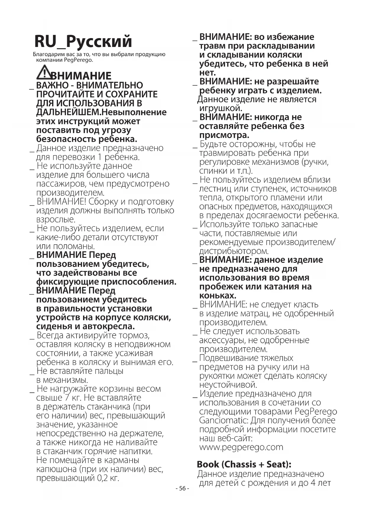 _ ВНИМАНИЕ: не следует класть в изделие матрац, не одобренный производителем. _ Не следует использовать аксессуары, не одобренные производителем. _ Подвешивание тяжелых предметов на ручку или на рукоятки может сделать коляску неустойчивой. _ Изделие предназначено для использования в сочетании со следующими товарами PegPerego Ganciomatic: Для получения более подробной информации посетите наш веб-сайт: www.pegperego.com Book (Chassis + Seat): Данное изделие предназначено для детей с рождения и до 4 лет- 57 - или весом до 22 кг (в зависимости от того, какой показатель будет достигнут раньше). Если вес ребенка превышает 15кг, данное кресло необходимо устанавливать только по направлению движения. _ ВНИМАНИЕ: Всегда пользуйтесь системой предохранительного крепления. Всегда используйте систему ремней с пятиточечным креплением. Всегда блокируйте поясной ремень с помощью лямки, проходящей между ногами. _ Передний бампер не предназначен для выдерживания веса ребенка. Передний бампер не предназначен для приподнимания сиденья вместе с сидящим в нем ребенком. Передний бампер не заменяет собой ремень безопасности. _ Для младенцев мы рекомендуем раскладывать спинку полностью. _ ВНИМАНИЕ: не используйте дождевик в закрытых помещениях и проверяйте, чтобы ребенку не было слишком жарко. Не размещайте его вблизи источников тепла и будьте осторожны с сигаретами. Дождевик нельзя использовать на коляске без капюшона или зонтика, к которому его можно было бы прикрепить. Используйте дождевик только под присмотром взрослого. Проверьте, чтобы дождевик не касался движущихся частей шасси или коляски. Снимите дождевик, прежде чем складывать шасси или коляску. Book Chassis + автокресло: предназначено для детей от рождения весом до 13 кг. При использовании с автокреслом изделие не заменяет колыбель или кроватку. На сон ребенка нужно переложить в люльку коляски, колыбель или кроватку. Book Chassis + корпус коляски: предназначено для детей от рождения весом до 9 кг. При использовании в сочетании с корпусом коляски: изделие подходит для детей, которые не могут самостоятельно сидеть и подниматься на четвереньки, а также переворачиваться. Максимальный вес ребенка: 9кг. Во время использования ручку для переноски (при наличии) следует держать вне корпуса коляски, чтобы она была недоступна для ребенка. Иллюстрации, на которых изображены элементы из ткани, могут не соответствовать приобретенной коллекции. Для получения более подробной информации посетите наш веб-сайт: www.pegperego.com ИНСТРУКЦИЯ ПО ЭКСПЛУАТАЦИИ BOOK CHASSIS 1 РАСКЛАДЫВАНИЕ. Прежде чем раскладывать раму, удалите (не пользуясь лезвиями) штампованный