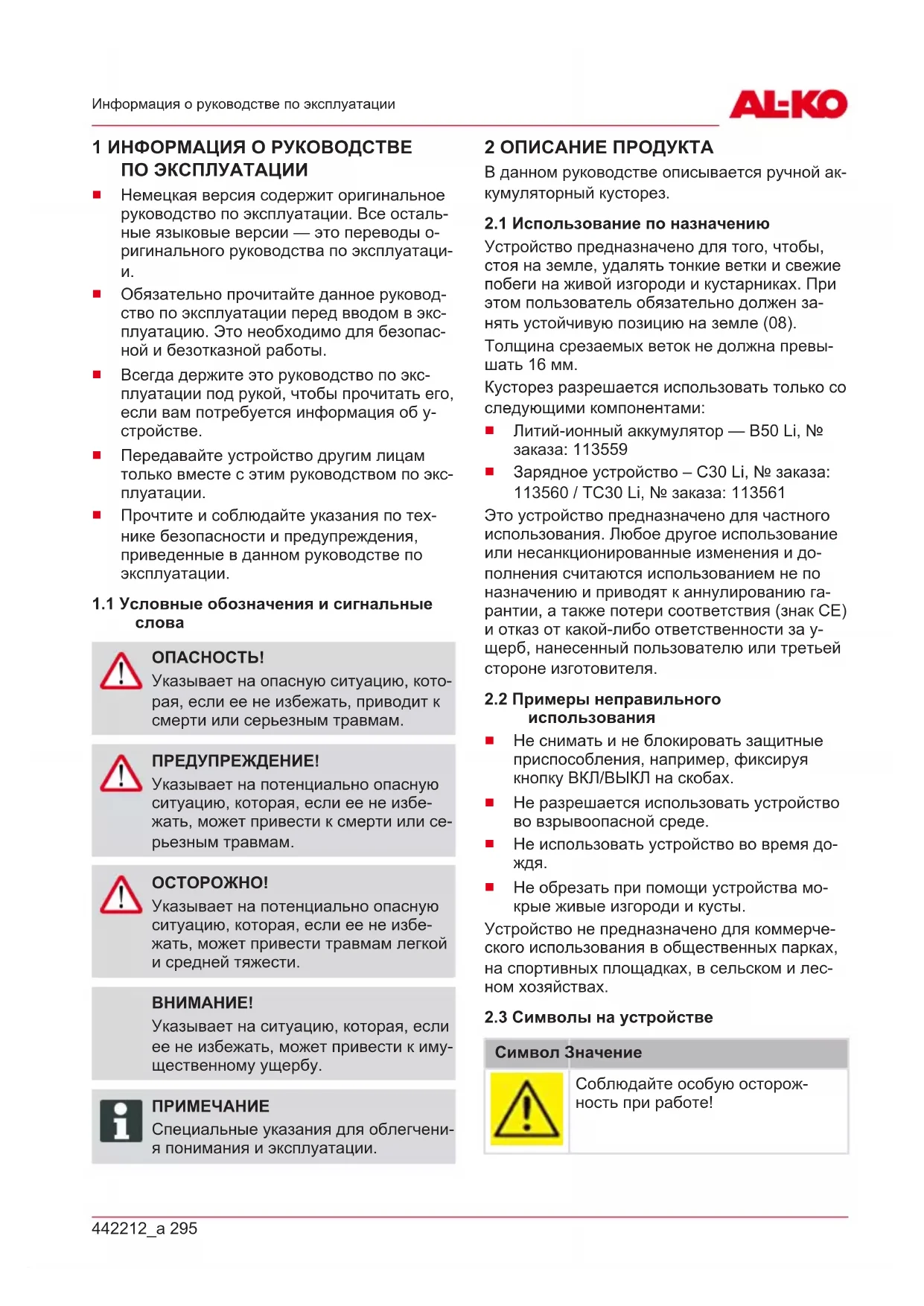 Специальные указания для облегчени- я понимания и эксплуатации. 2 ОПИСАНИЕ ПРОДУКТА В данном руководстве описывается ручной ак- кумуляторный кусторез.