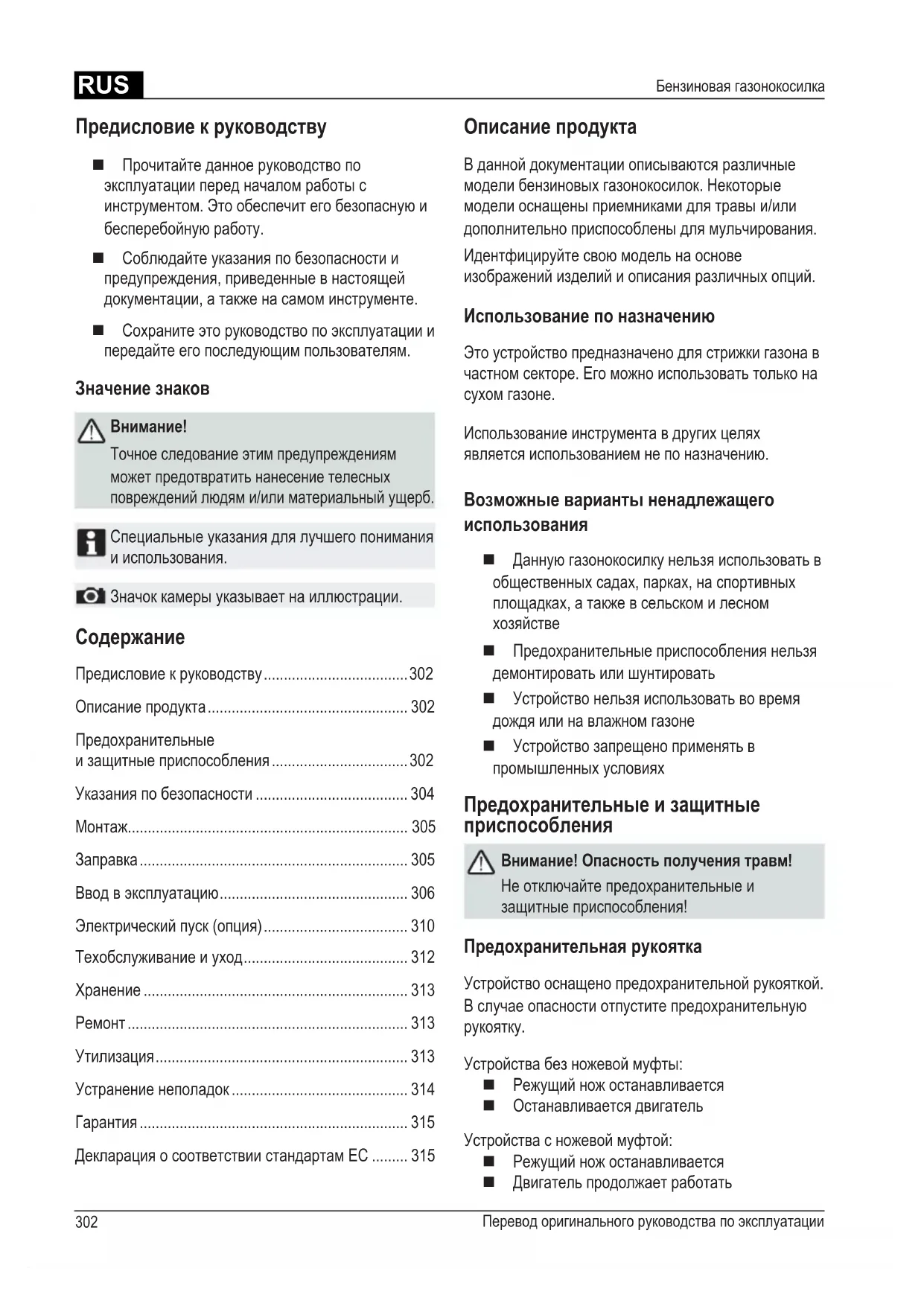 Дистанционноеуправлениеподачей газа,старт/стоп. Держитесьнарасстоянииотопаснойзоны. Отражательная заслонка Отражательнаязаслонкаобеспечиваетзащитуотвыбрасываемыхдеталей.RUS Перевод оригинального руководства по эксплуатации