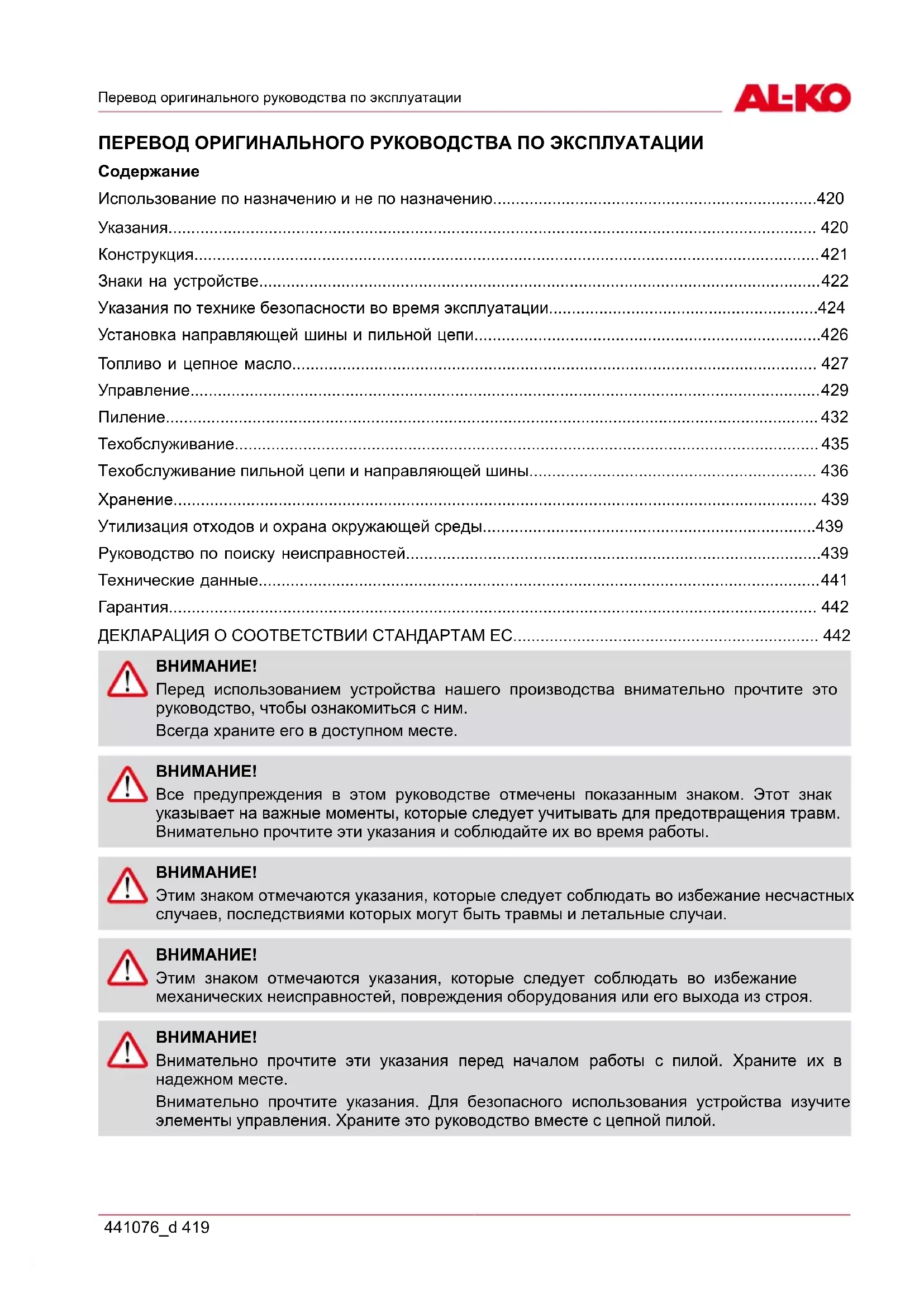 Внимательно прочтите эти указания перед началом работы с пилой. Храните их в надежном месте. Внимательно прочтите указания. Для безопасного использования устройства изучите элементы управления. Храните это руководство вместе с цепной пилой.ru 420 BKS 3835 / BKS 4040