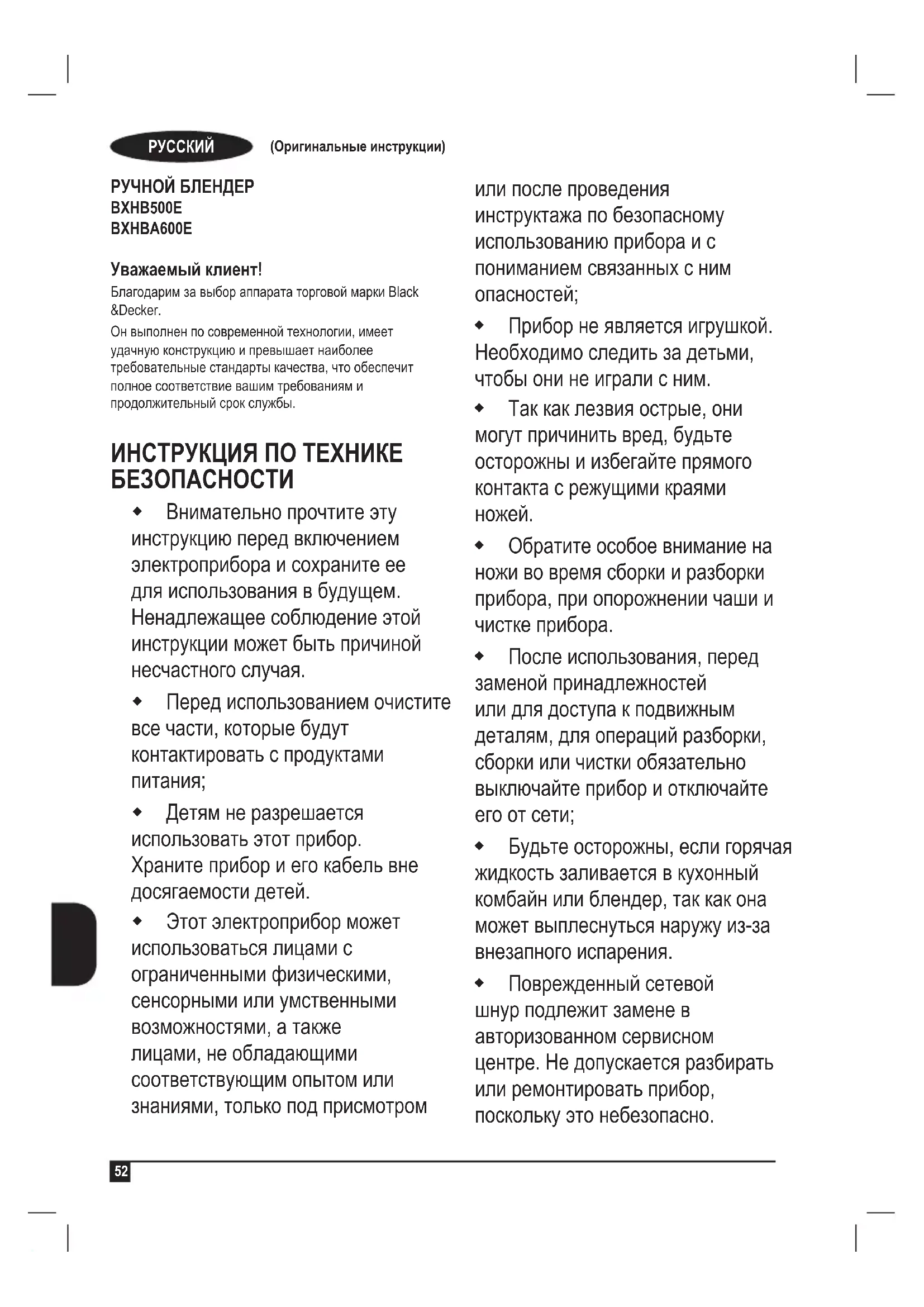 РУЧНОЙ БЛЕНДЕР BXHB500E BXHBA600E Уважаемый клиент! Благодарим за выбор аппарата торговой марки Black &Decker. Он выполнен по современной технологии, имеет удачную конструкцию и превышает наиболее требовательные стандарты качества, что обеспечит полное соответствие вашим требованиям и продолжительный срок службы. ИНСТРУКЦИЯ ПО ТЕХНИКЕ БЕЗОПАСНОСТИ Внимательно прочтите эту инструкцию перед включением электроприбора и сохраните ее для использования в будущем. Ненадлежащее соблюдение этой инструкции может быть причиной несчастного случая. Перед использованием очистите все части, которые будут контактировать с продуктами