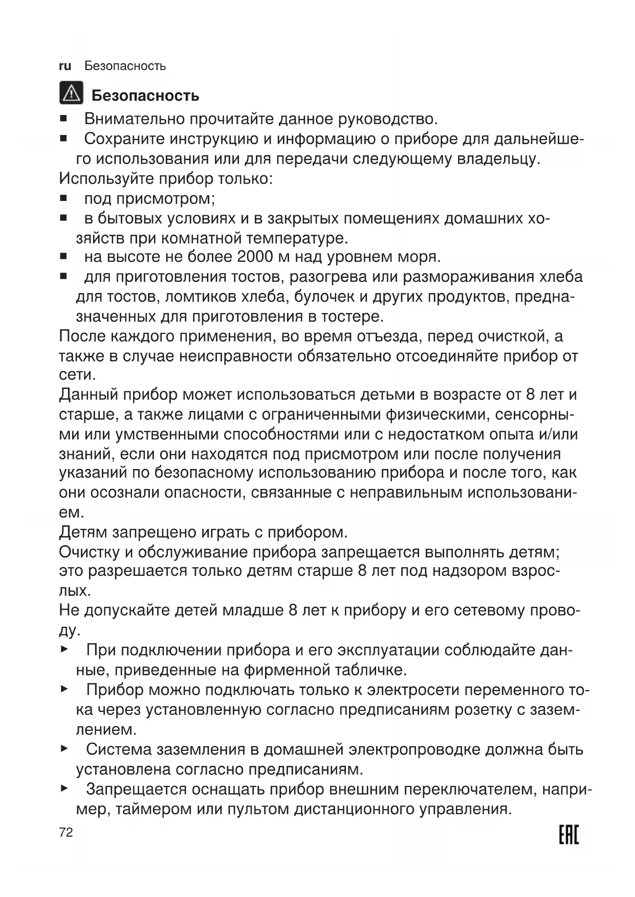 Безопасность ¡ Внимательно прочитайте данное руководство. ¡ Сохраните инструкцию и информацию о приборе для дальнейше- го использования или для передачи следующему владельцу. Используйте прибор только: ¡ под присмотром; ¡ в бытовых условиях и в закрытых помещениях домашних хо- зяйств при комнатной температуре. ¡ на высоте не более 2000м над уровнем моря. ¡ для приготовления тостов, разогрева или размораживания хлеба для тостов, ломтиков хлеба, булочек и других продуктов, предна- значенных для приготовления в тостере. После каждого применения, во время отъезда, перед очисткой, а также в случае неисправности обязательно отсоединяйте прибор от