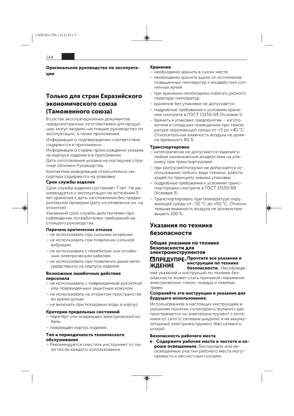 – необходимо хранить в сухом месте – необходимо хранить вдали от источников повышенных температур и воздействия сол- нечных лучей – при хранении необходимо избегать резкого перепада температур – хранение без упаковки не допускается – подробные требования к условиям хране- ния смотрите в ГОСТ15150-69 (Условие1) – Хранить в упаковке предприятия– изгото- вителя в складских помещениях при темпе- ратуре окружающей среды от +5 до +40°С. Относительная влажность воздуха не долж- на превышать 80%. Транспортировка – категорически не допускается падение и любые механические воздействия на упа- ковку при транспортировке – при разгрузке/погрузке не допускается ис- пользование любого вида техники, работа- ющей по принципу зажима упаковки – подробные требования к условиям транс- портировки смотрите в ГОСТ15150-69 (Условие5) – Транспортировать при температуре окру- жающей среды от −50°С до +50°С. Относи- тельная влажность воздуха не должна пре- вышать 100%. Указания по технике безопасностиРусский Общие указания по технике безопасности для электроинструментовРусский