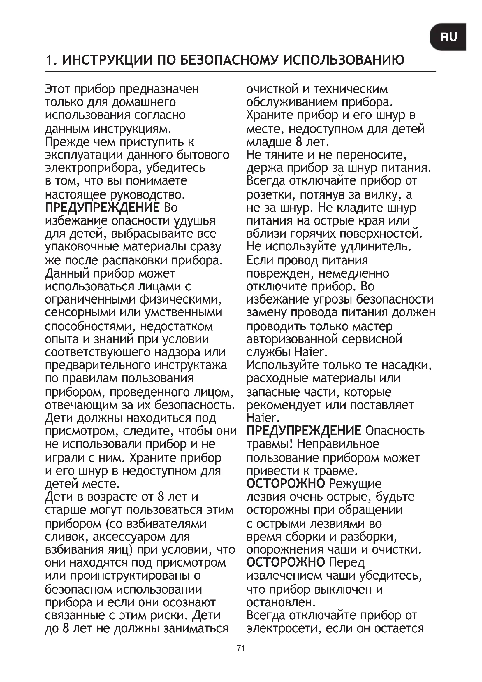 Sähköliitäntä 220-240V~50/60Hz Virta 1000W FI71 Этот прибор предназначен только для домашнего использования согласно данным инструкциям. Прежде чем приступить к эксплуатации данного бытового электроприбора, убедитесь в том, что вы понимаете настоящее руководство. ПРЕДУПРЕЖДЕНИЕ Во избежание опасности удушья для детей, выбрасывайте все упаковочные материалы сразу же после распаковки прибора. Данный прибор может использоваться лицами с ограниченными физическими, сенсорными или умственными способностями, недостатком опыта и знаний при условии соответствующего надзора или предварительного инструктажа по правилам пользования прибором, проведенного лицом, отвечающим за их безопасность. Дети должны находиться под присмотром, следите, чтобы они не использовали прибор и не играли с ним. Храните прибор и его шнур в недоступном для детей месте. Дети в возрасте от 8 лет и старше могут пользоваться этим прибором (со взбивателями сливок, аксессуаром для взбивания яиц) при условии, что они находятся под присмотром или проинструктированы о безопасном использовании прибора и если они осознают связанные с этим риски. Дети до 8 лет не должны заниматься очисткой и техническим обслуживанием прибора. Храните прибор и его шнур в месте, недоступном для детей младше 8 лет. Не тяните и не переносите, держа прибор за шнур питания. Всегда отключайте прибор от розетки, потянув за вилку, а не за шнур. Не кладите шнур питания на острые края или вблизи горячих поверхностей. Не используйте удлинитель. Если провод питания поврежден, немедленно отключите прибор. Во избежание угрозы безопасности замену провода питания должен проводить только мастер авторизованной сервисной службы Haier. Используйте только те насадки, расходные материалы или запасные части, которые рекомендует или поставляет Haier. ПРЕДУПРЕЖДЕНИЕ Опасность травмы! Неправильное пользование прибором может привести к травме. ОСТОРОЖНО Режущие лезвия очень острые, будьте осторожны при обращении с острыми лезвиями во время сборки и разборки, опорожнения чаши и очистки. ОСТОРОЖНО Перед извлечением чаши убедитесь, что прибор выключен и остановлен. Всегда отключайте прибор от электросети, если он остается