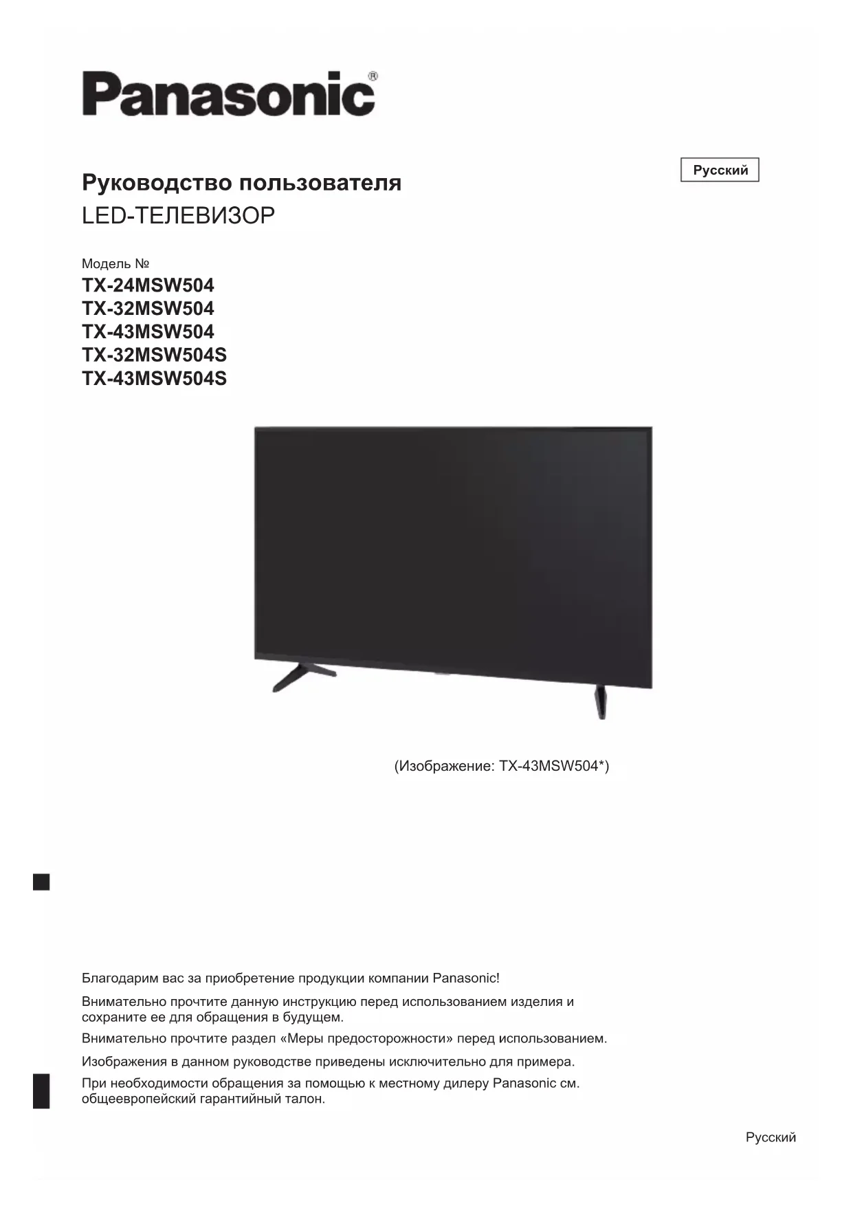 Благодарим вас за приобретение продукции компании Panasonic! Внимательно прочтите данную инструкцию перед использованием изделия и сохраните ее для обращения в будущем. Внимательно прочтите раздел «Меры предосторожности» перед использованием. Изображения в данном руководстве приведены исключительно для примера. При необходимости обращения за помощью к местному дилеру Panasonic см. общеевропейский гарантийный талон. (Изображение: TX-43MSW504*) РусскийРусский