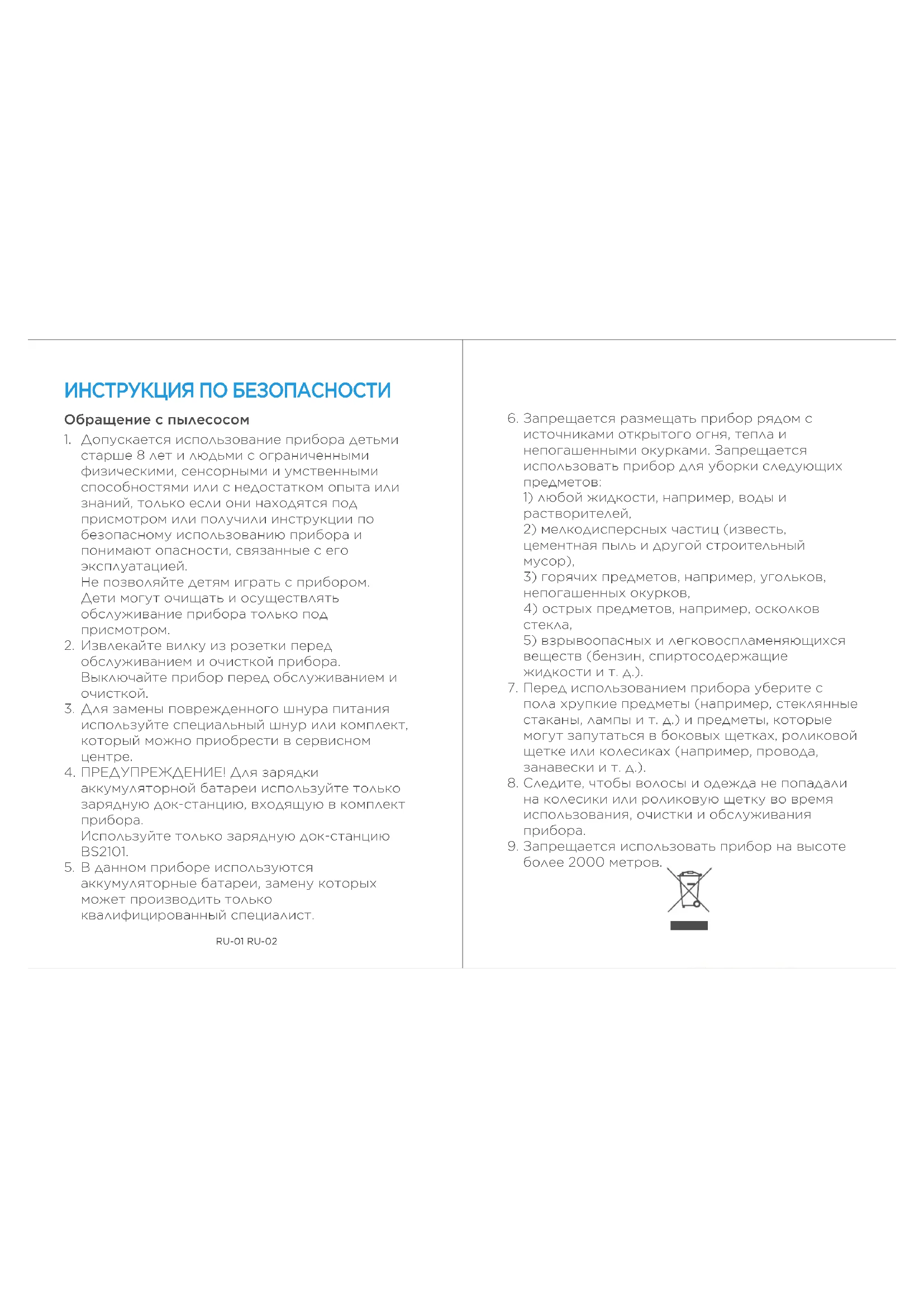 Więcej rozwiązań usterek znajduje się w części przypominanie o błędach w aplikacji Opis błędu Możliwe przyczyny Rozwiązanie Opis błędu Możliwe przyczyny RozwiązanieRU-01 RU-02 ИНСТРУКЦИЯ ПО БЕЗОПАСНОСТИ Обращение с пылесосом Допускается использование прибора детьми старше 8 лет и людьми с ограниченными физическими, сенсорными и умственными способностями или с недостатком опыта или знаний, только если они находятся под присмотром или получили инструкции по безопасному использованию прибора и понимают опасности, связанные с его эксплуатацией. Не позволяйте детям играть с прибором. Дети могут очищать и осуществлять обслуживание прибора только под присмотром. Извлекайте вилку из розетки перед обслуживанием и очисткой прибора. Выключайте прибор перед обслуживанием и